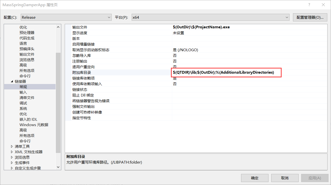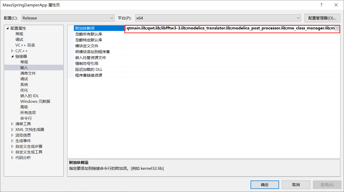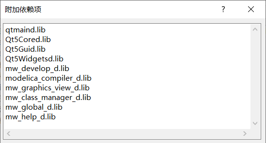 qtmaind.lib Qt5Cored.lib Qt5Guid.lib Qt5Widgetsd.lib mw_develop_d.lib mw_graphics_view_d.lib mw_class_manager_d.lib mw_global_d.lib mw_help_d.lib mw_sim_inst_d.lib mw_sim_plot_d.lib mw_develop_d.libRelease 下的附件依赖项设置为: