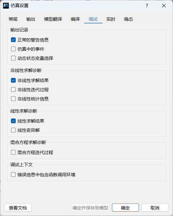 | 积分算法设置 | initialStepSize | 初始积分步长,即第一个积分步的步长,仅适用于变步长方法。如果用户在仿真设置界面中指定了初始积分步长,则仿真时使用用户设定的值,否则由求解器内部提供默认值 |