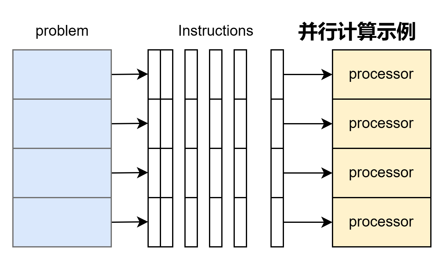 人们一般将“将问题拆分为可以同时解决的离散部分”这一环节称之为任务分解, 而将“任务在不同的处理器上同时执行”这件事情称之为并行计算。