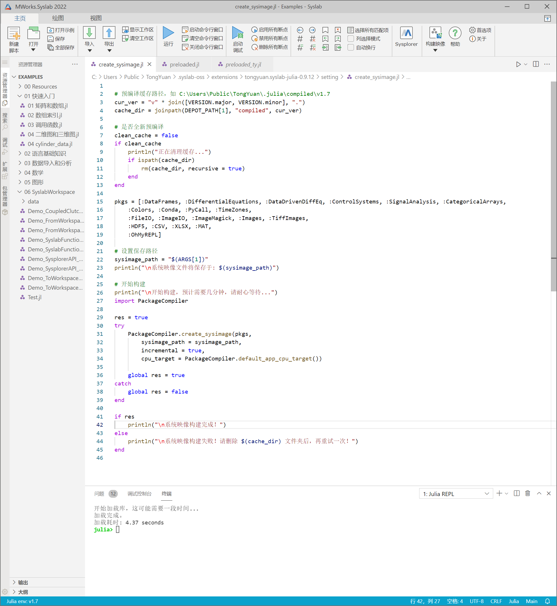 系统映像文件(JuliaSysimage.dll)能够提升Julia函数库的加载速度,Syslab支持一键构建并应用系统映像文件,并支持用户自定义修改构建脚本。