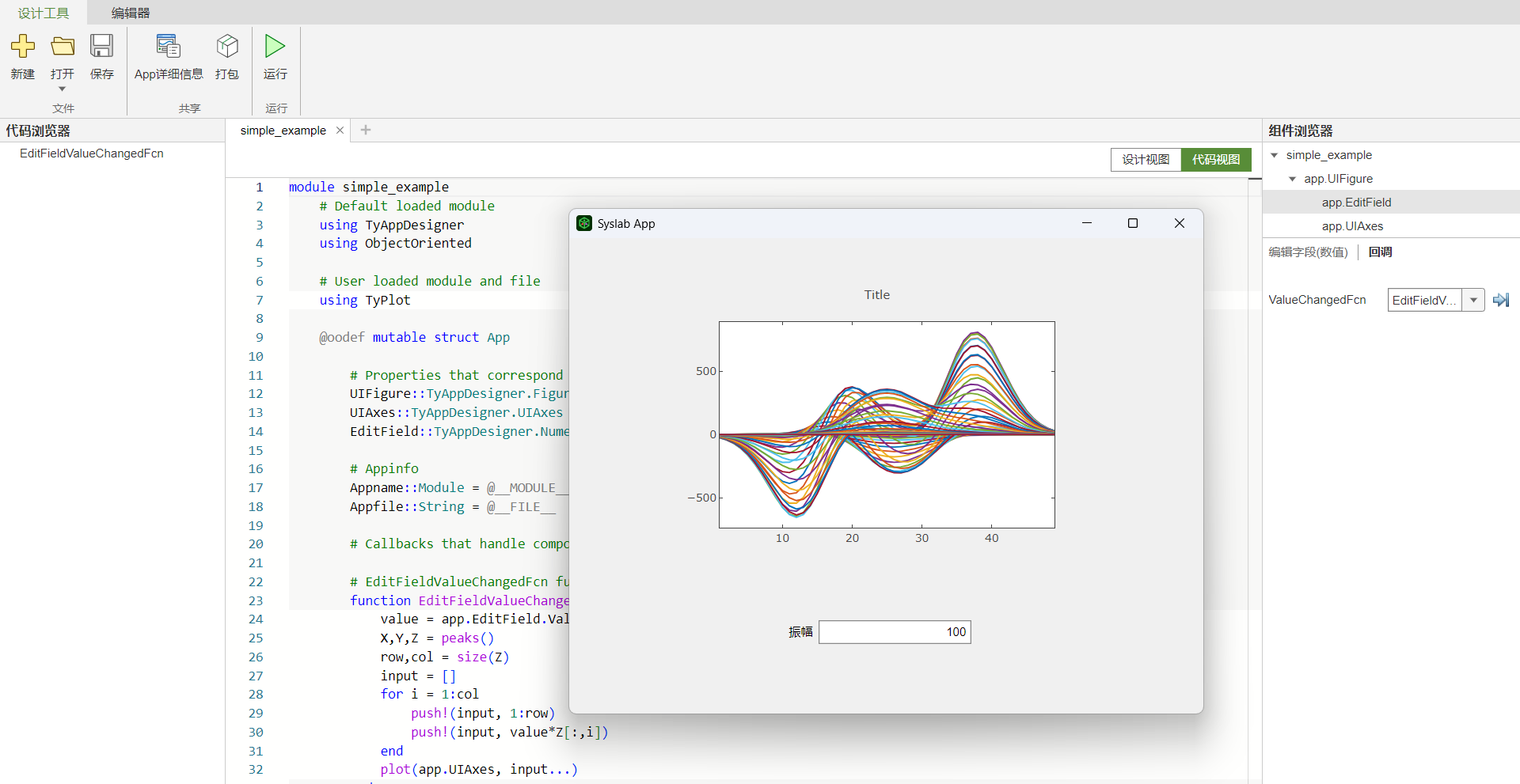 全新推出 APP 设计工具,APP 设计工具是一个交互式开发环境,用于设计 APP 布局并对其行为进行编程。它提供了 Syslab 编辑器的完整集成版本和大量交互式 UI 组件,并允许您通过从 APP 设计工具直接将 APP 打包为安装程序文件中来分发 APP。
