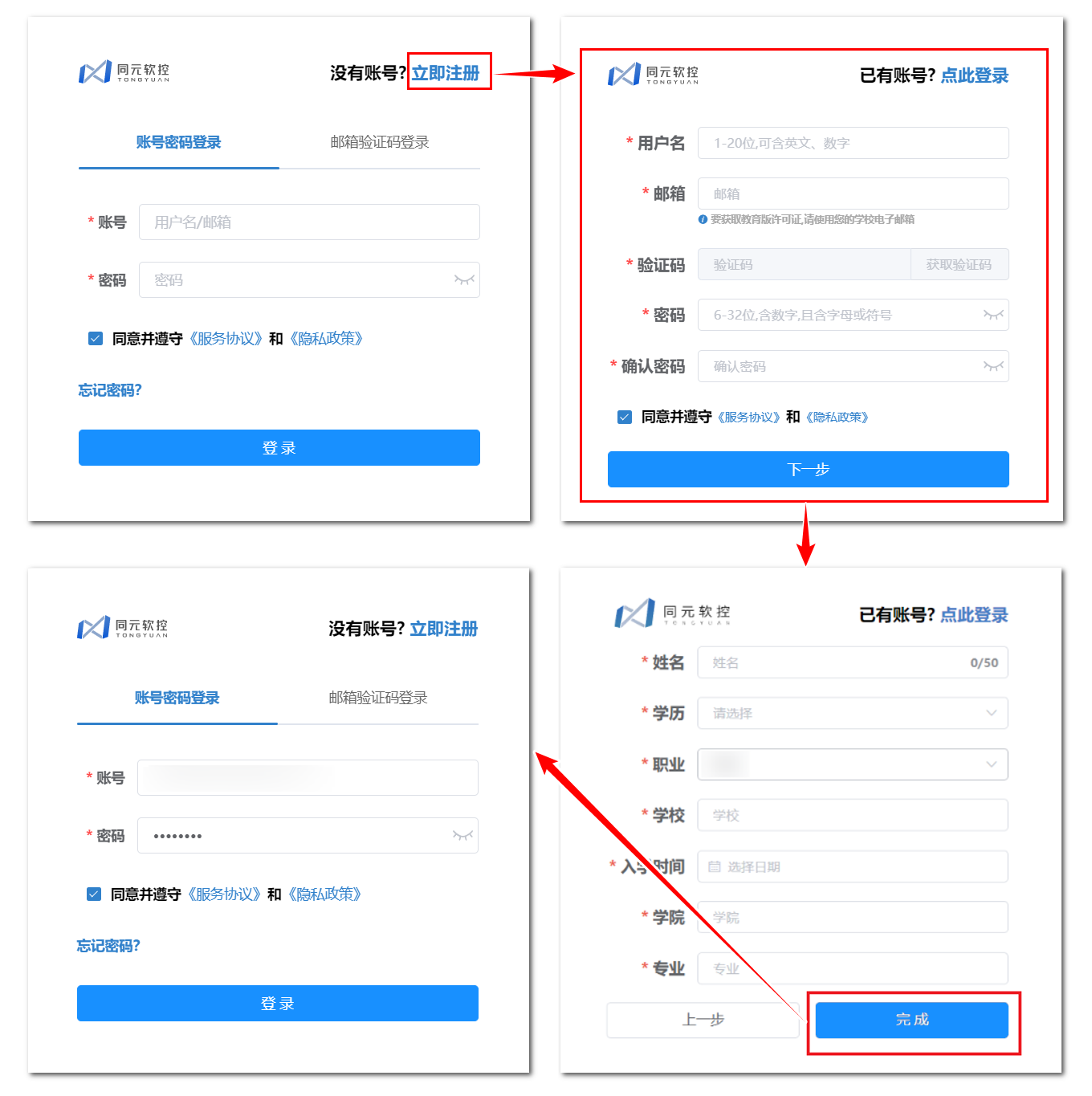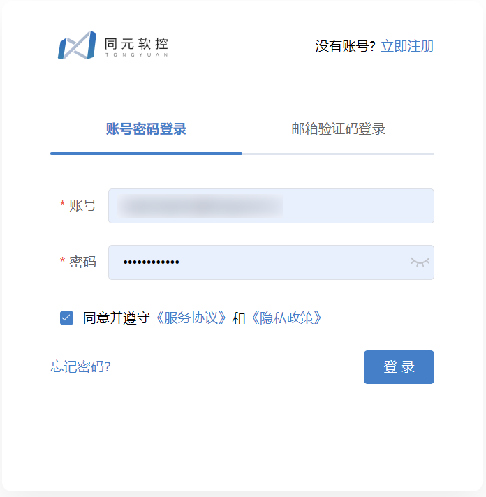 账号注册完成后,通过账号密码或邮箱验证码方式登录,完成同元账号登录。