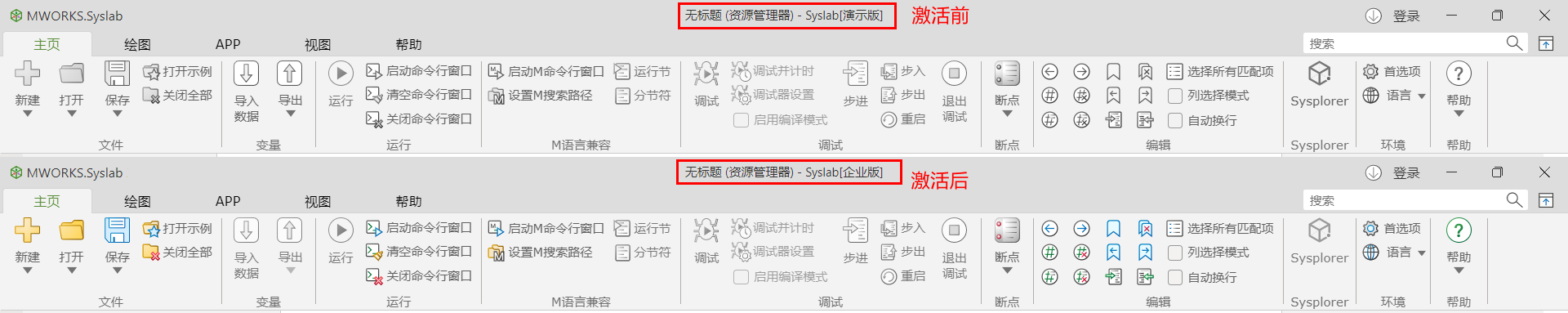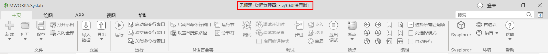 Syslab 在未授权状态下运行时,主窗口标题文字中显示“演示版”字样,此时系统功能是受限的。