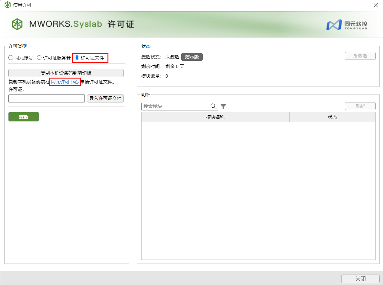 在使用许可窗口,选择许可证文件,单击同元许可中心,跳转至同元账号登录页面。