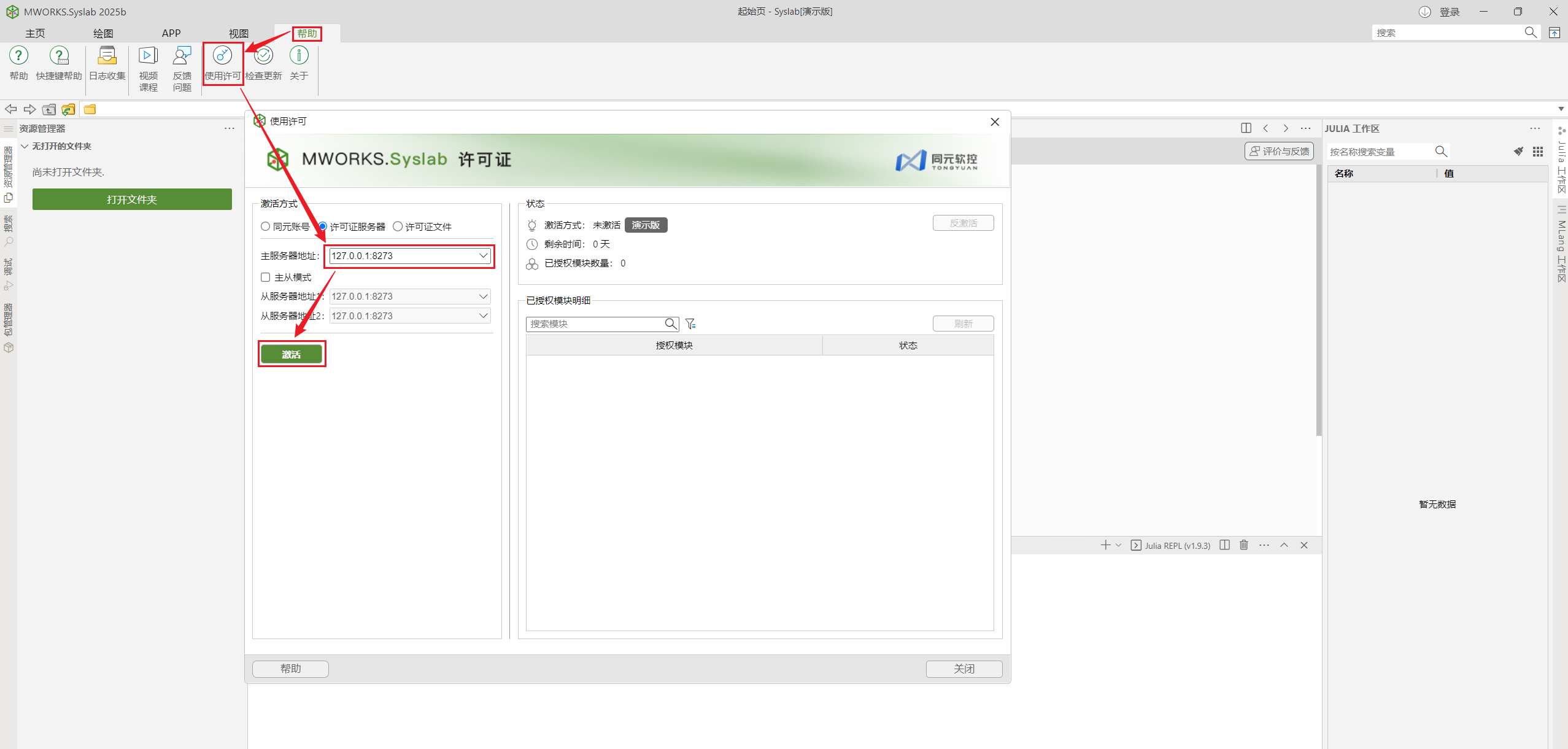 启动 Syslab > 单击帮助 > 单击使用许可 > 弹出使用许可窗口 > 选择许可证服务器,并将获取到的 License 服务器地址粘贴到主服务器地址的文本框中,单击激活。