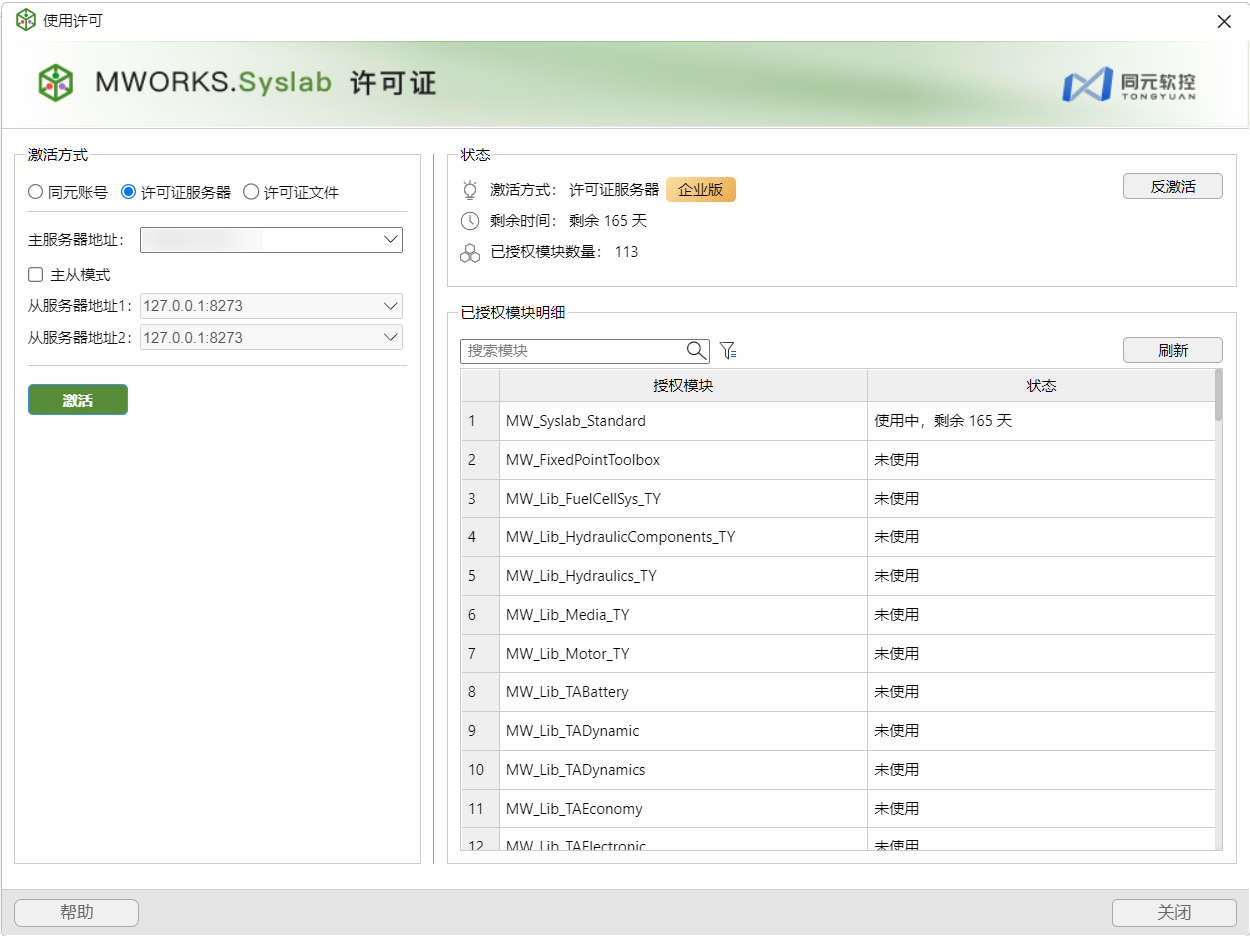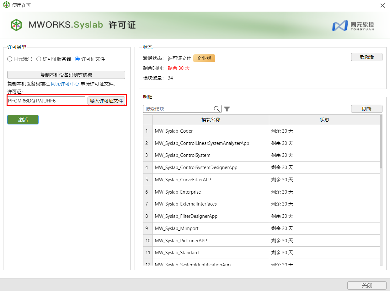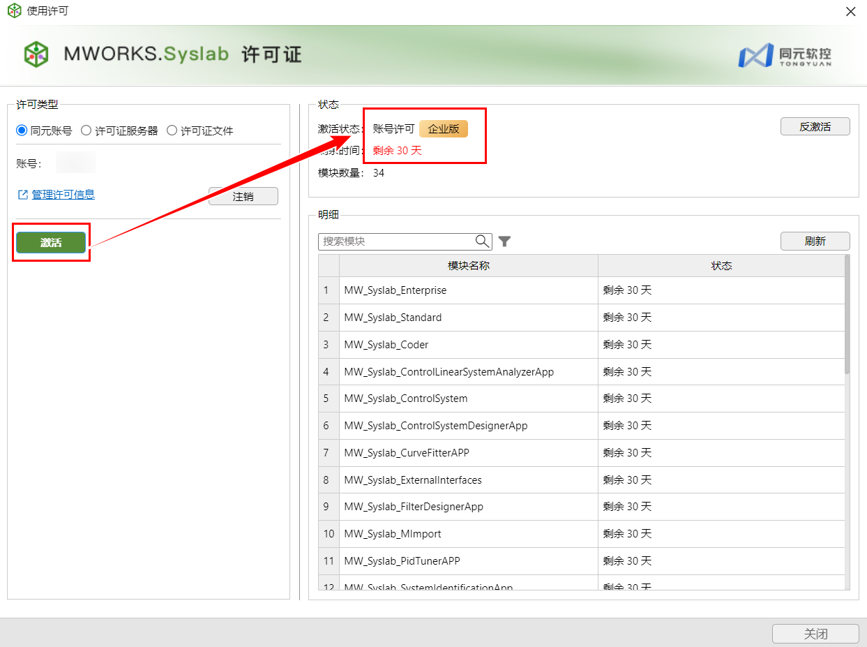 申请成功后,返回 Syslab,打开帮助 > 使用许可 > 同元账号,单击激活,企业版 license 激活成功,有效期 1 个月。