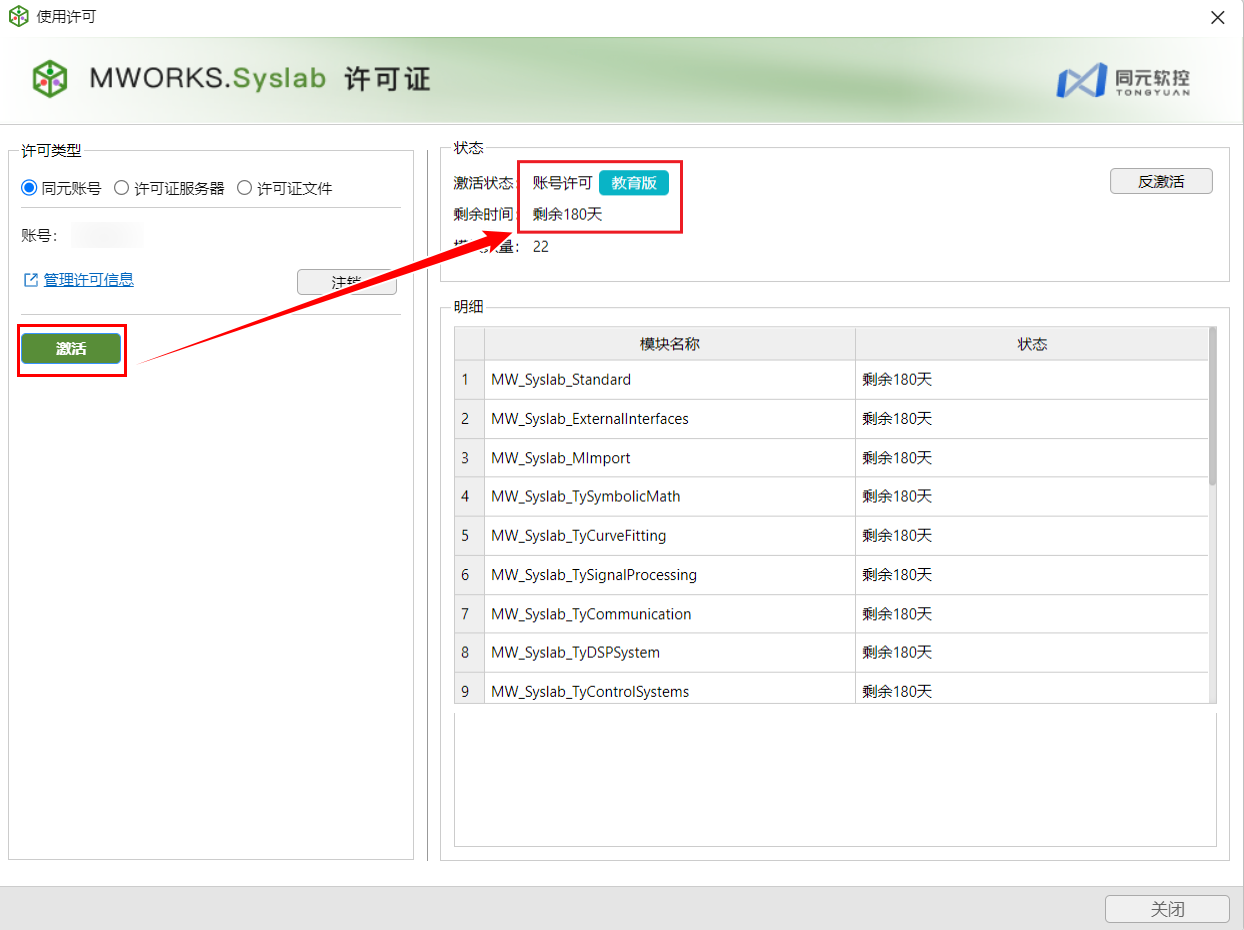 申请成功后,返回 Syslab,打开帮助 > 使用许可 > 同元账号,单击激活,教育版 license 激活成功,有效期 6 个月。
