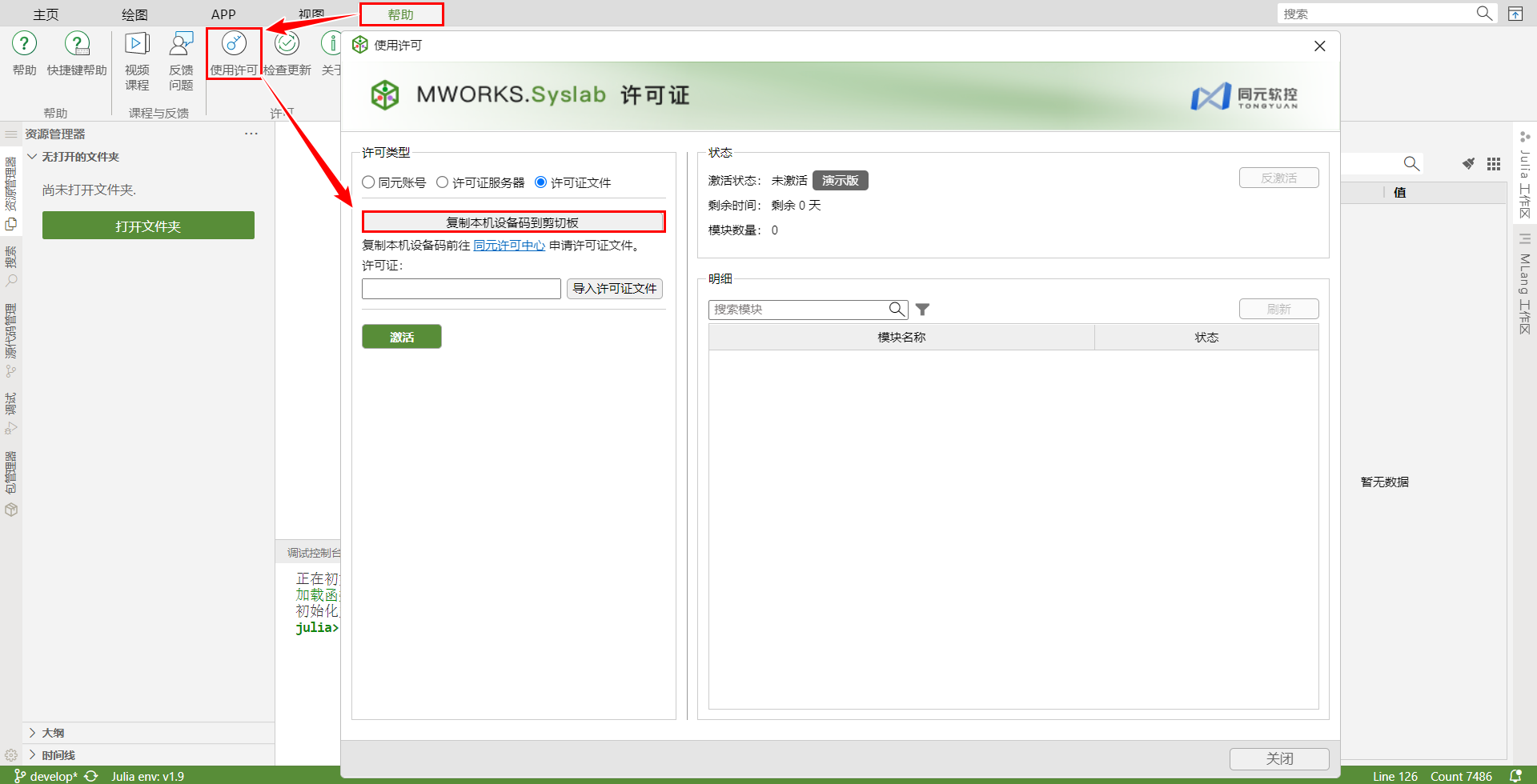 单机版 License 支持在无网络场景使用,Syslab 单机版使用许可配置步骤如下: