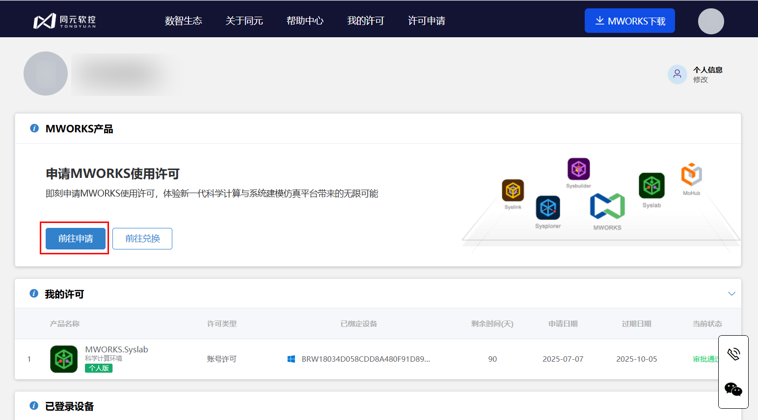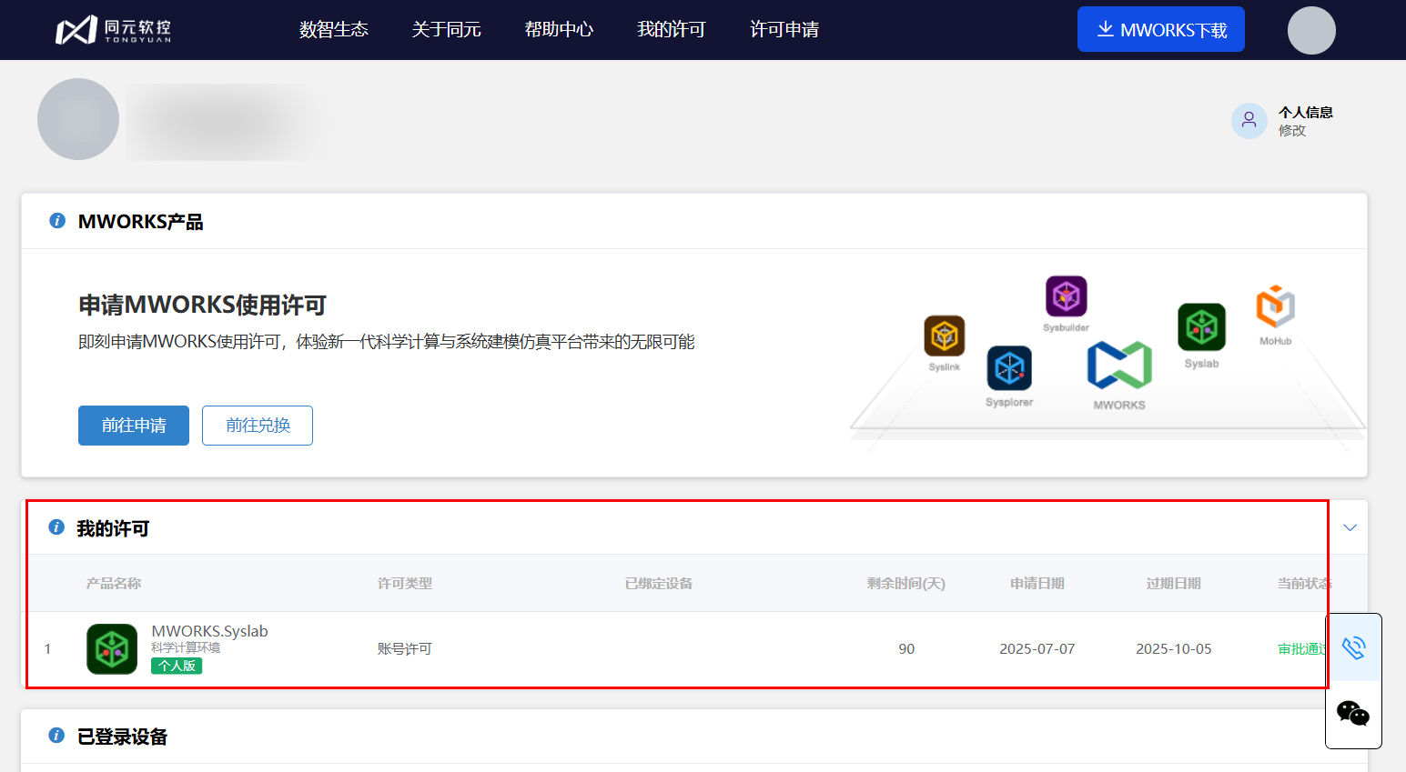申请成功后,自动跳转至“许可中心”页面,在我的许可中查看当前账号绑定的许可信息。