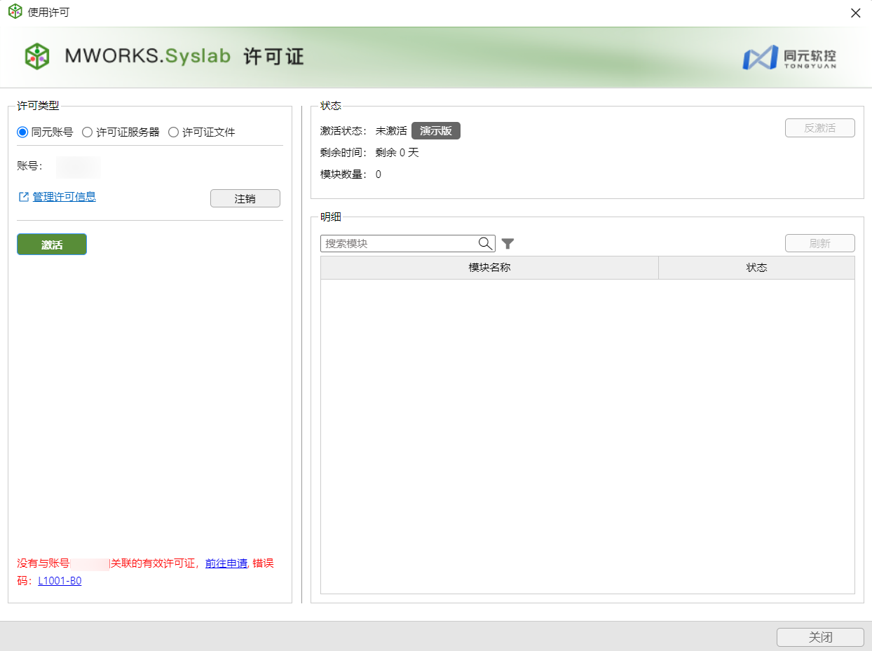 首次注册/申请 license 已到期,登录同元账号后单击激活,提示“没有与账号[用户名]关联的许可证,前往申请,错误码:L1001-B0”,请单击窗口左下角前往申请,跳转至许可申请页面完成申请。