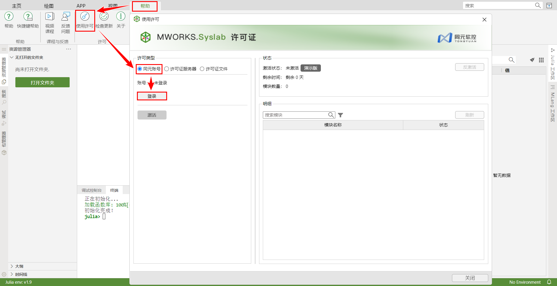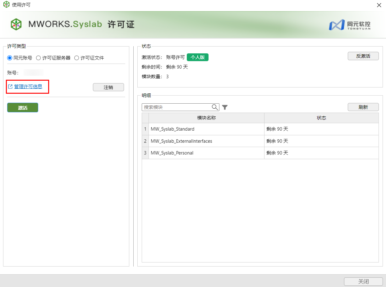返回 Syslab,打开帮助 > 使用许可 > 同元账号,单击激活,个人版 license 激活成功,有效期 3 个月。