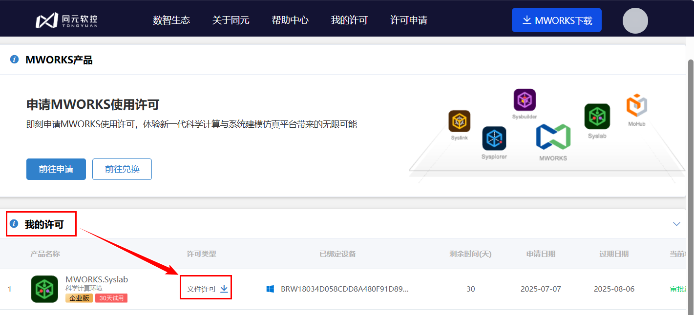 返回许可中心页面,在我的许可下,单击文件许可进行下载。
