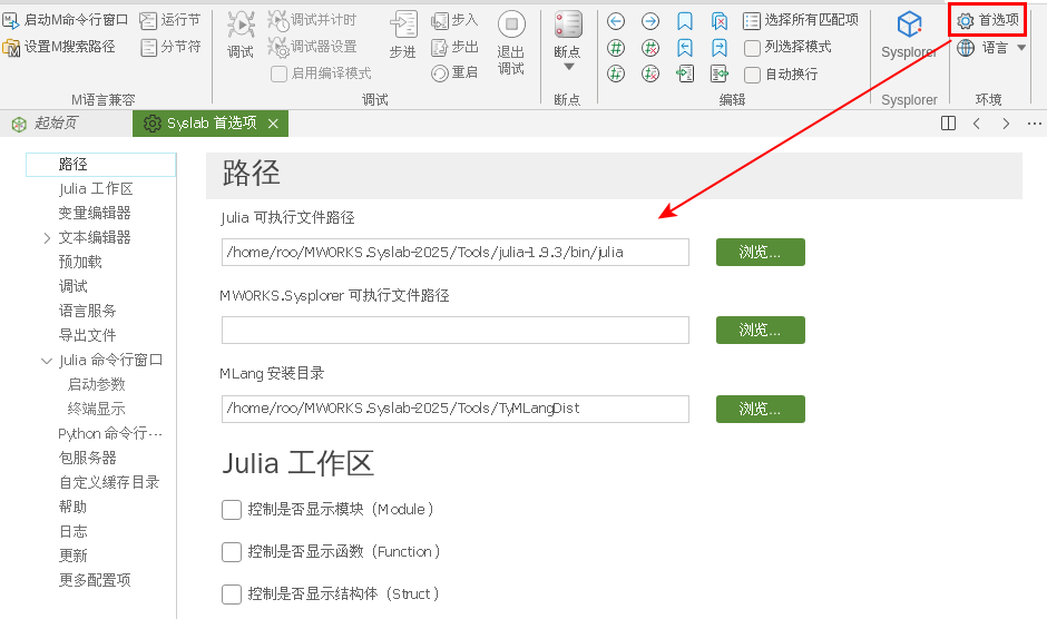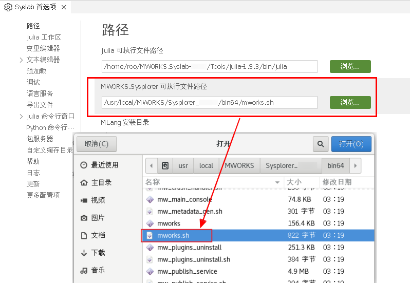 /usr/local/MWORKS/Sysplorer/bin64/mworks.sh。如果未安装 Sysplorer 或者 Sysplorer 安装在其它位置,则该选项内容为空,此时需要用户手动设置。B. 修改方式