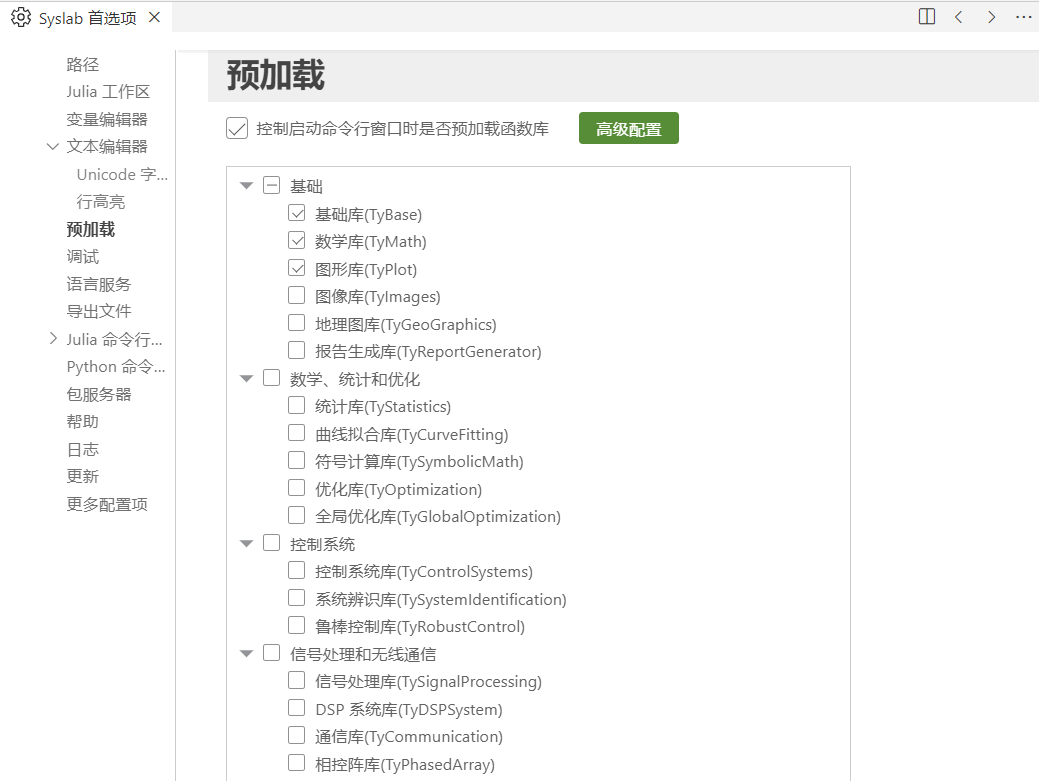 系统默认不勾选控制启动命令行窗口时预加载函数库。用户可以选择需要预加载的函数库,当 REPL(即命令行窗口)启动时将加载这些已勾选的函数库,如下图所示: