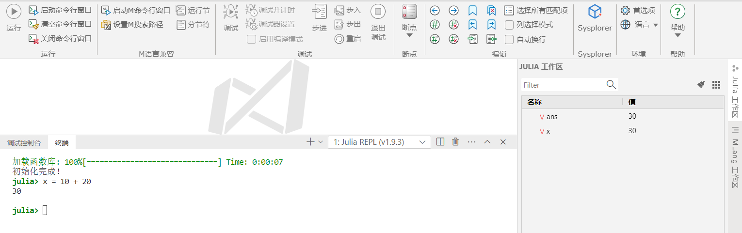 启动命令行窗口,启动 Julia 命令行窗口。在该窗口中输入x = 10 + 20,按下回车后将立即回显命令执行结果“30”。