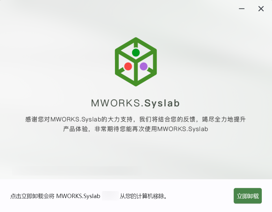 卸载完成后单击感谢使用,期待再会按钮, Syslab 安装文件夹中所有内容都被删除。您也可以选择勾选左下角的删除 MWORKS.Syslab 缓存目录选项,个人数据的缓存配置信息同步删除。