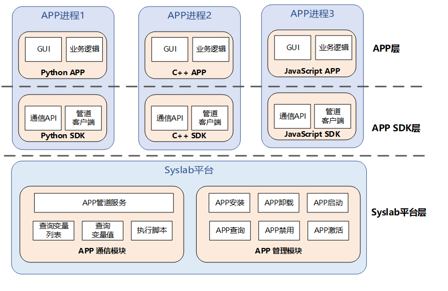 APP SDK 层:负责 APP 与 Syslab 平台之间的通信,实现了进程间通信的管道客户端,并提供了 APP 通信 API。Syslab 提供多款 APP SDK,包括 Python SDK、C++ SDK、JavaScript SDK 等,便于用户快速开发。