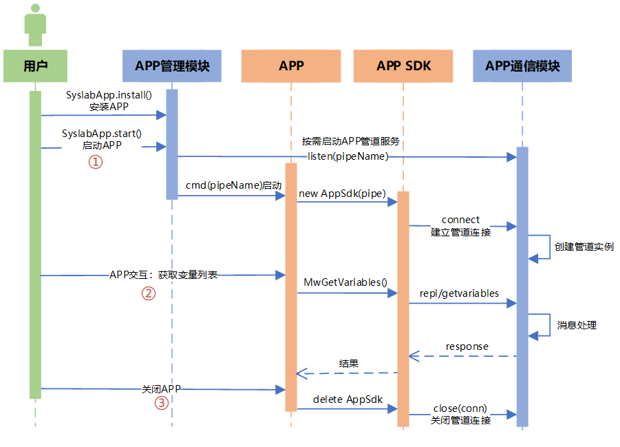 - APP 调用 APP SDK 在 APP 进程内启动 APP 管道客户端,与 Syslab 建立管道连接