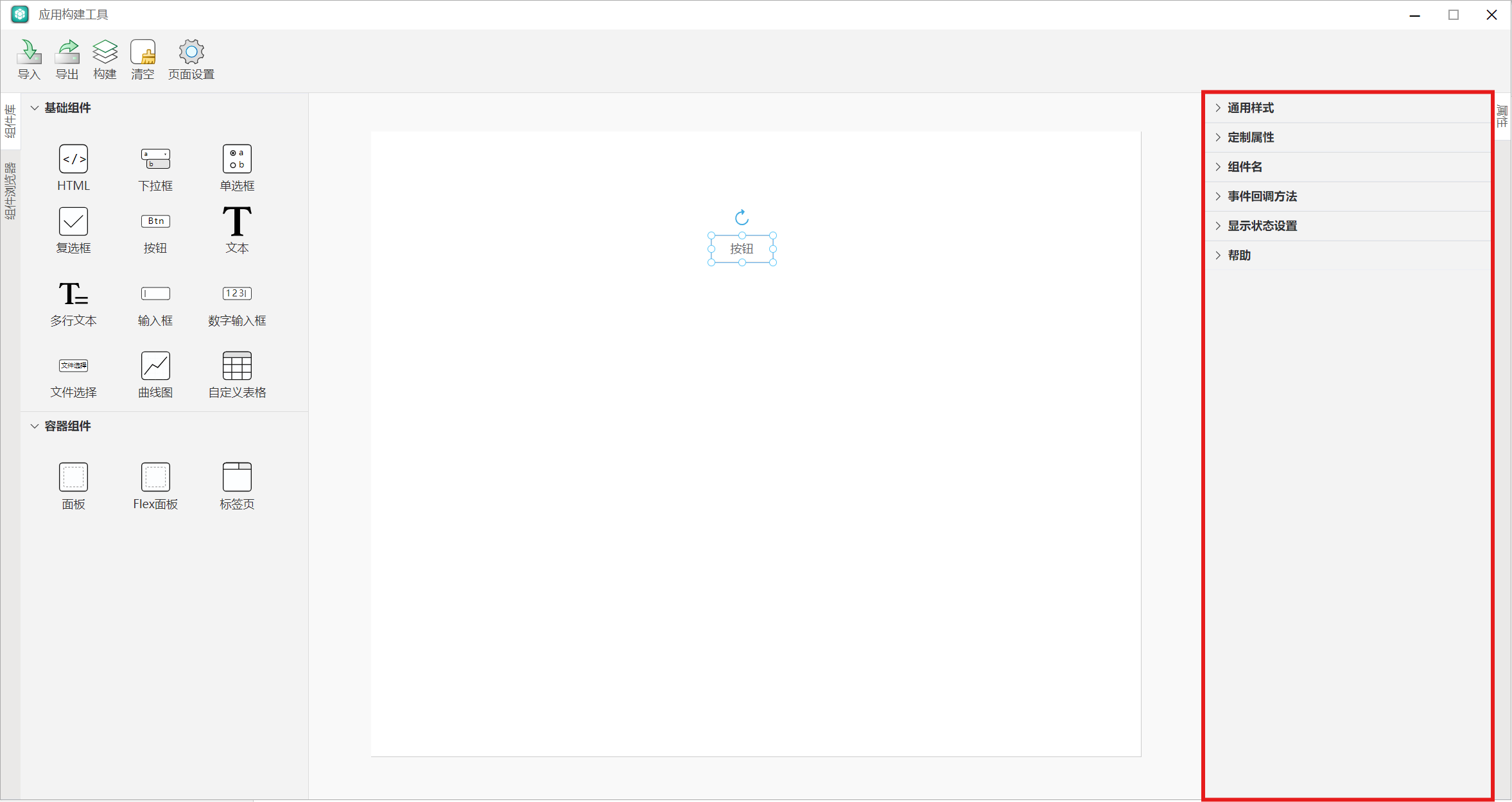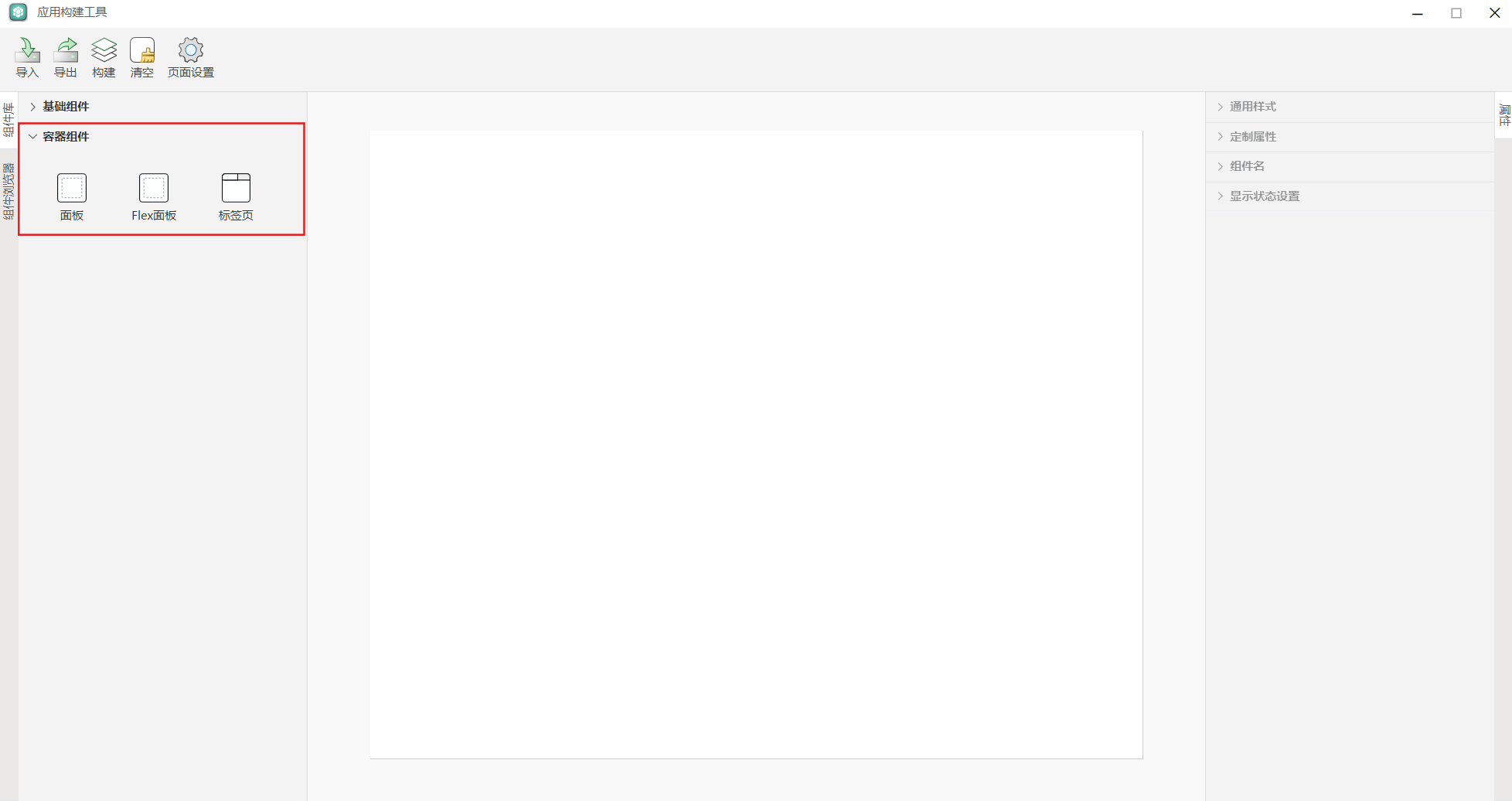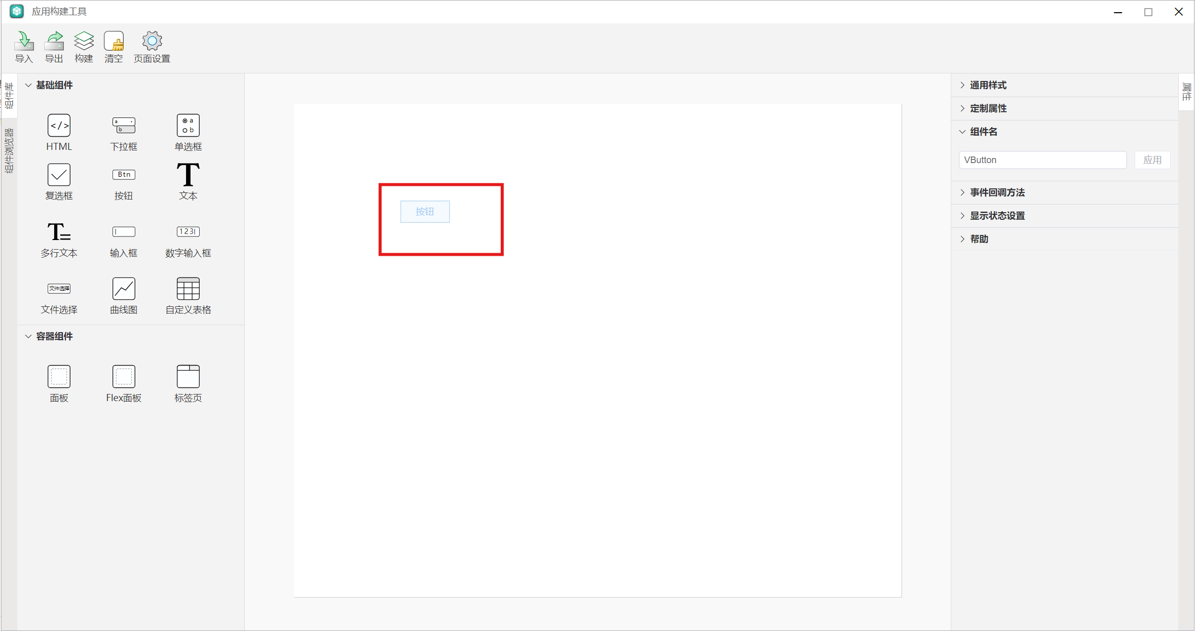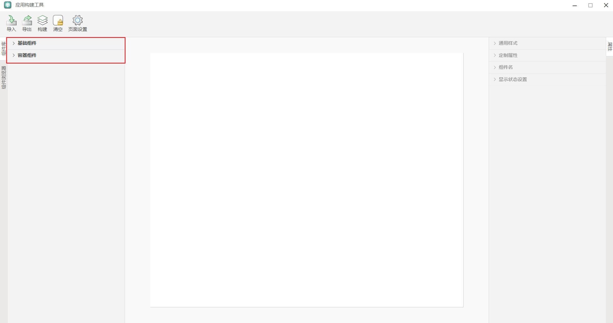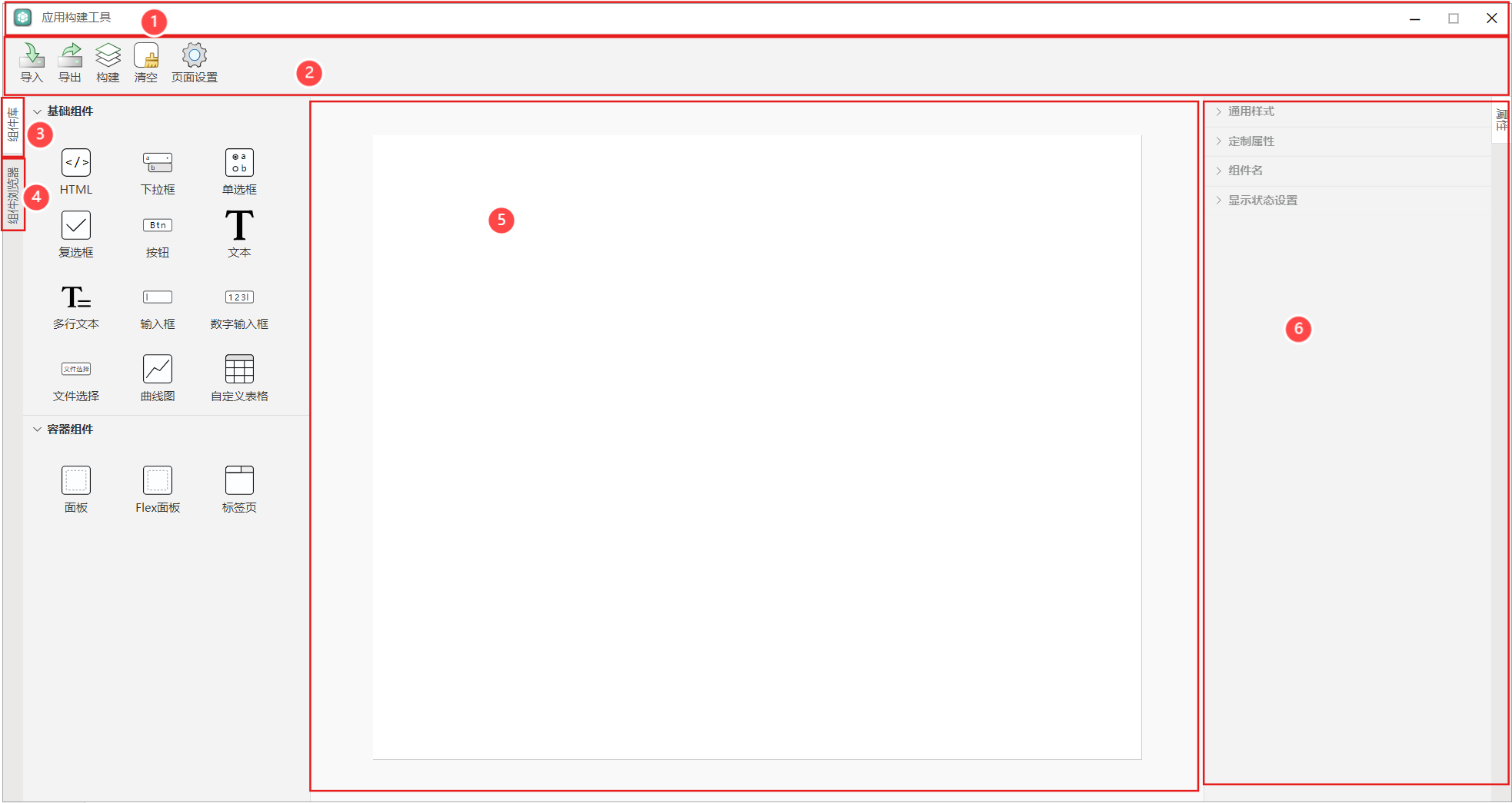 ②:工具栏:显示常用工具按钮、设计文件的导入导出、清空画布、APP 打包构建、页面设置等。
