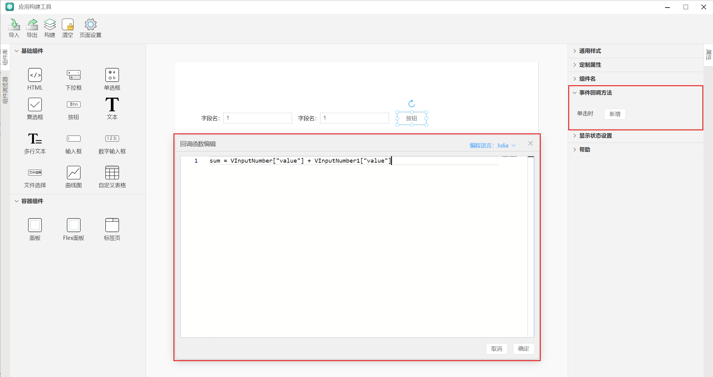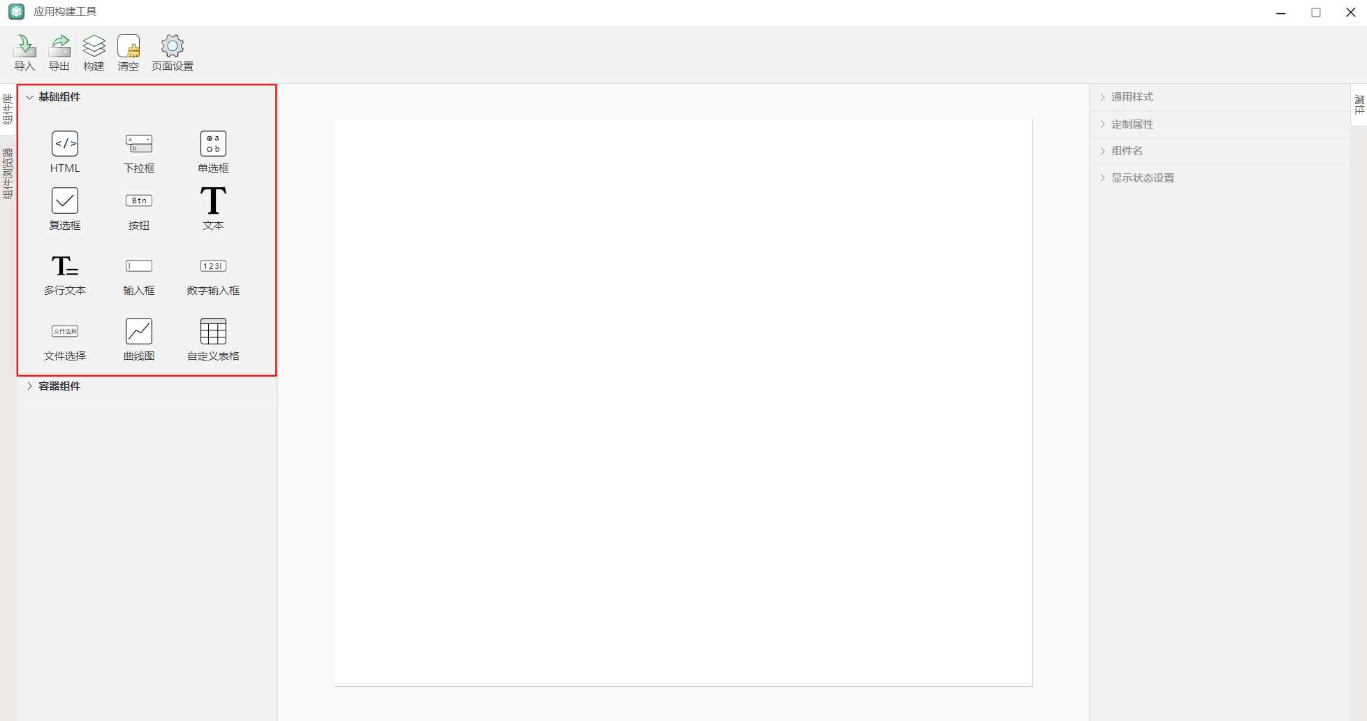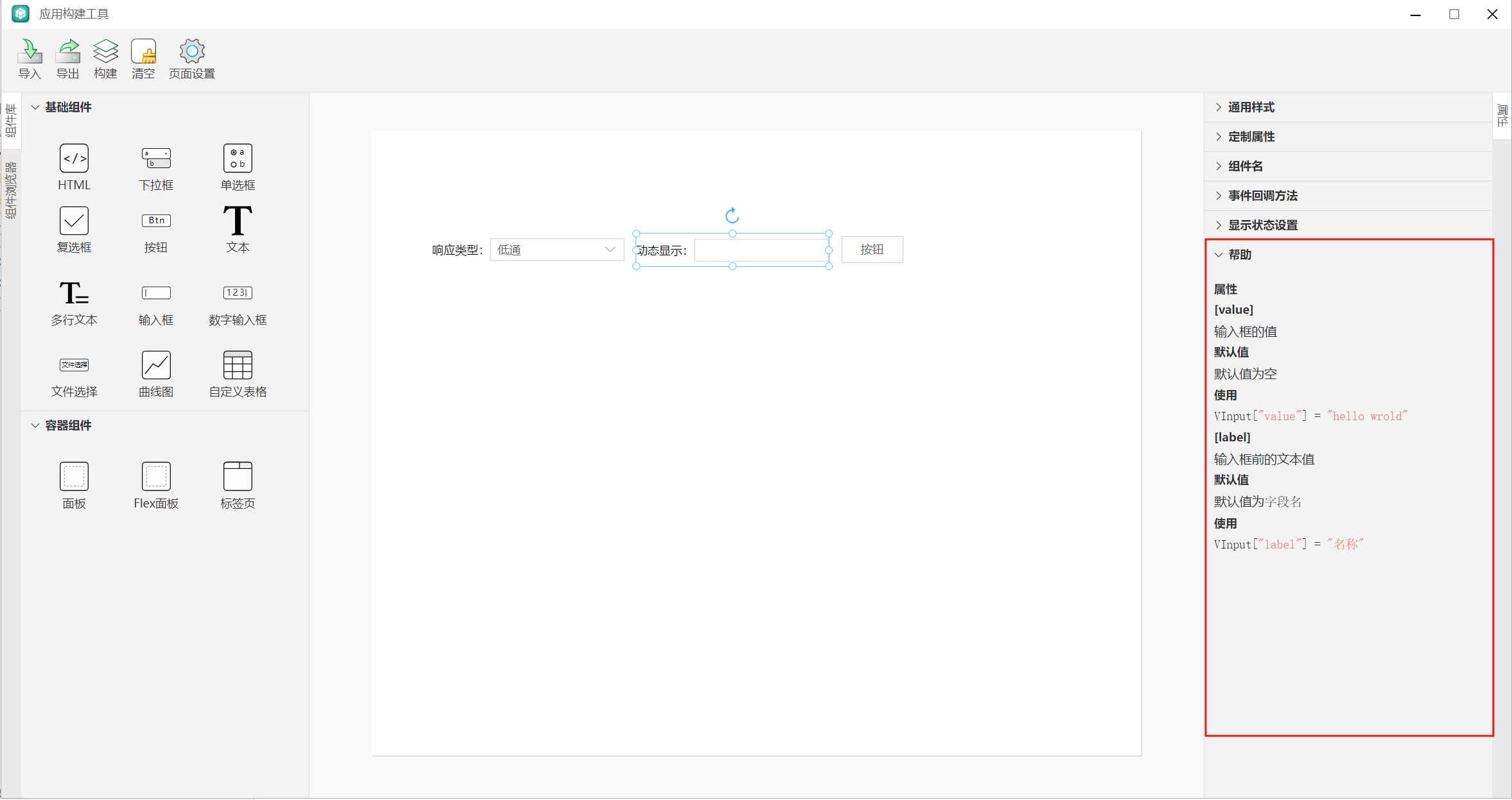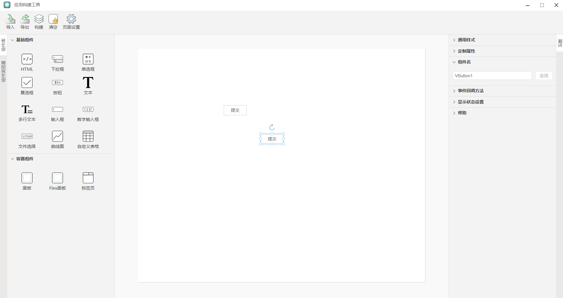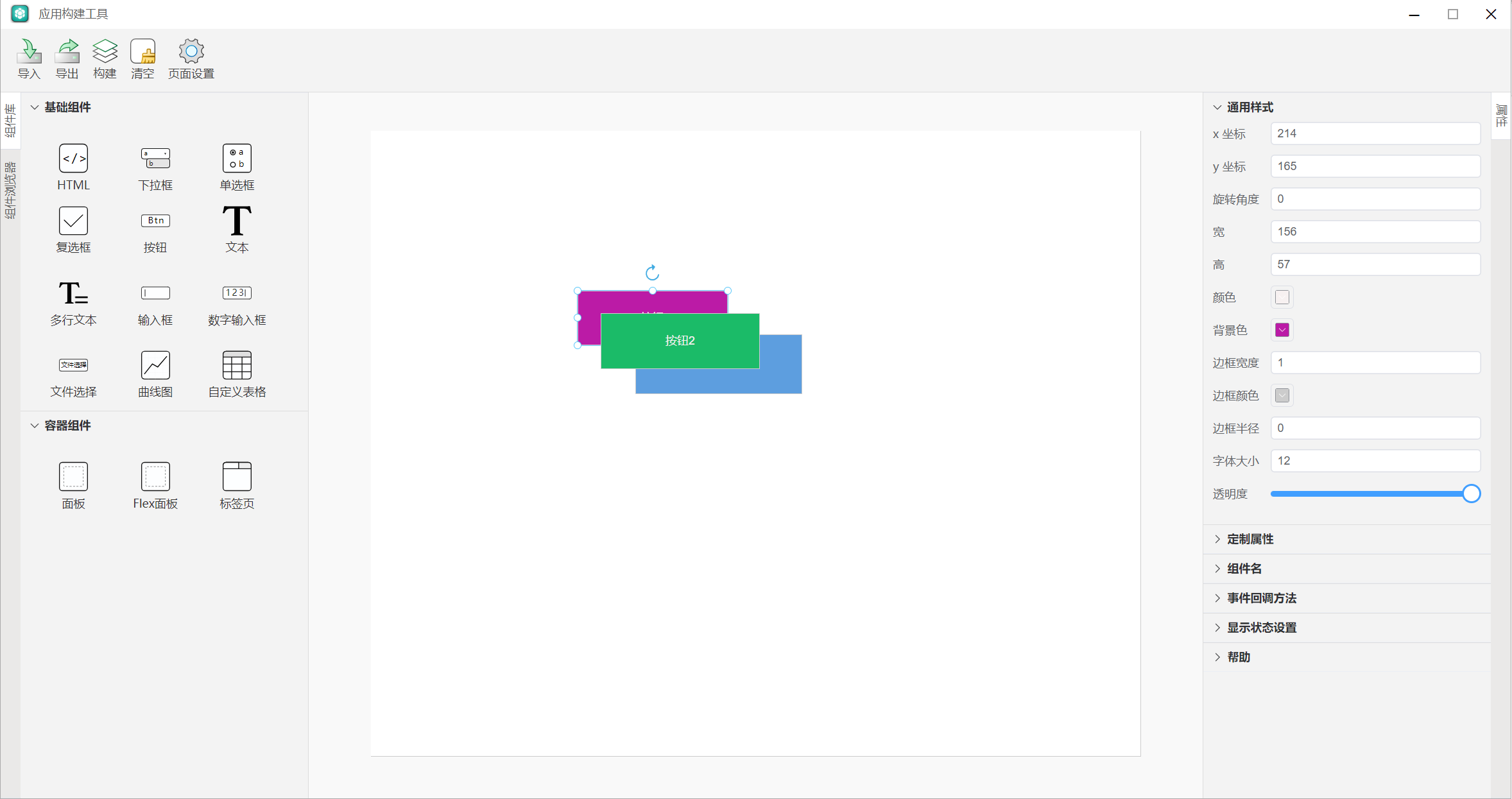 ②:工具栏:显示常用工具按钮、设计文件的导入导出、清空画布、APP 打包构建、页面设置等。