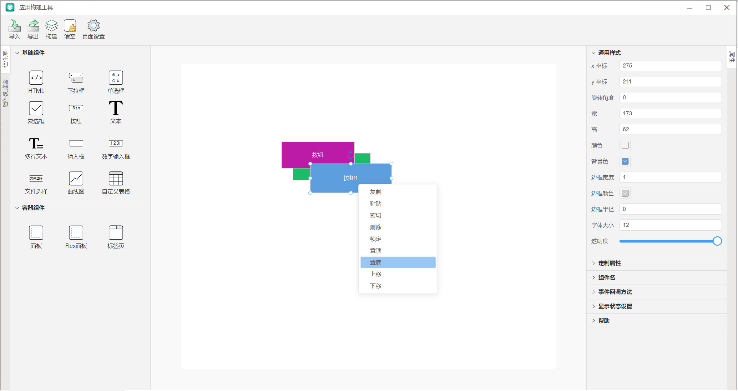 单击右键置底菜单项后,所选组件的层级设置为最下层,被其他组件遮挡。