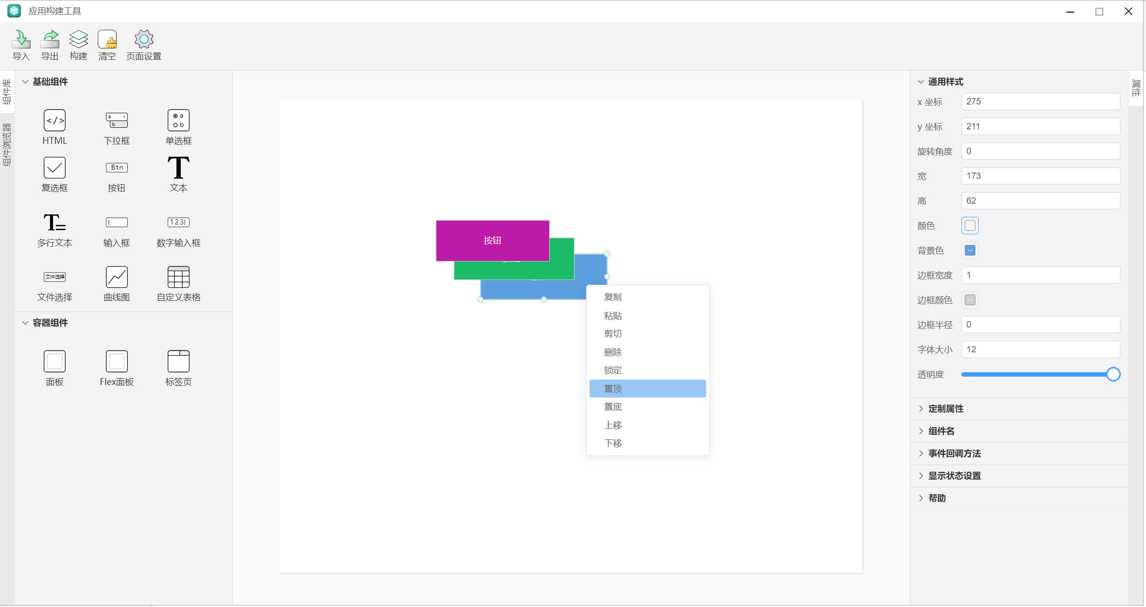 单击右键置顶菜单项后,所选组件的层级设置为最上层,不会被其他组件遮挡。