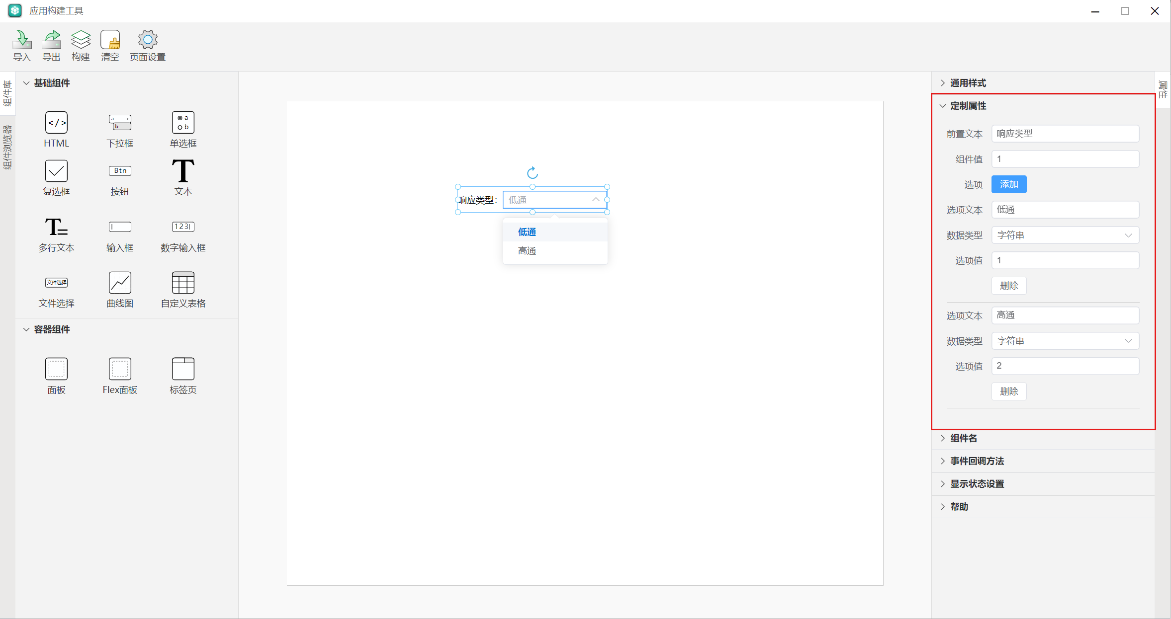 定制属性支持的设置项和组件有关,为组件特有。例如下拉框组件,需要设置的就是下拉选项列表,而按钮组件需要设置的就是按钮的显示文本。