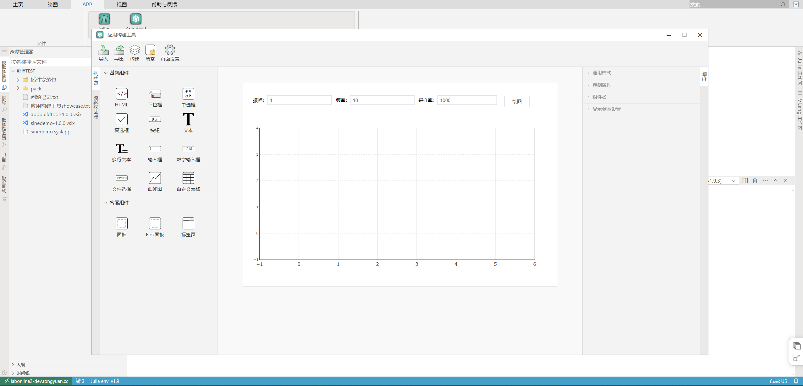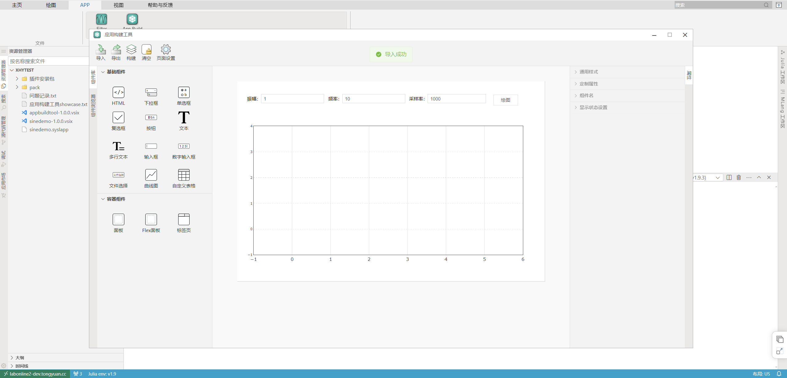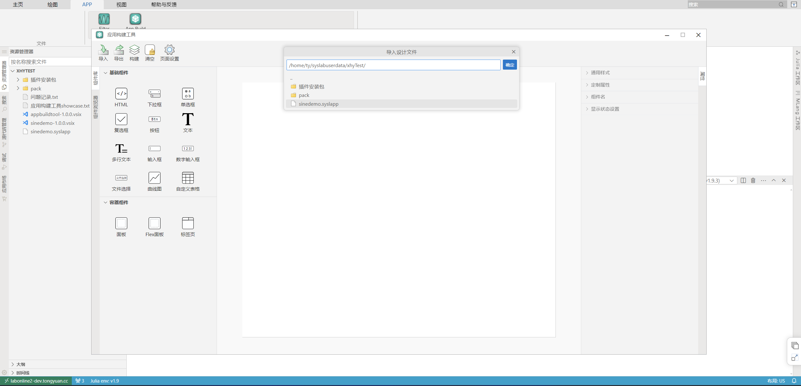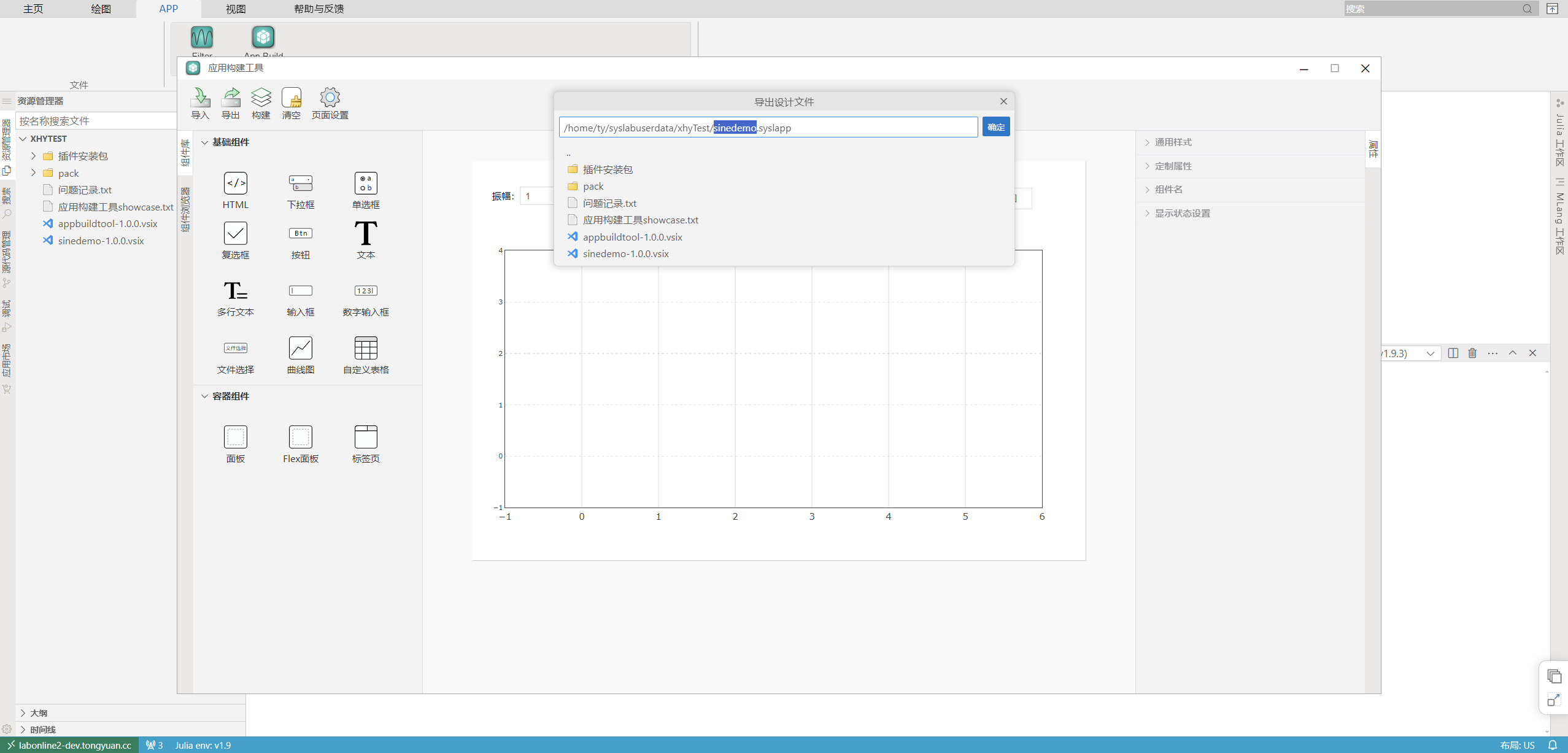 导出可以将当前 APP 设计状态导出为 syslabapp 文件持久化保存。单击工具栏区域导出按钮,弹出文件选择框弹窗,设置路径及文件名回车即可。