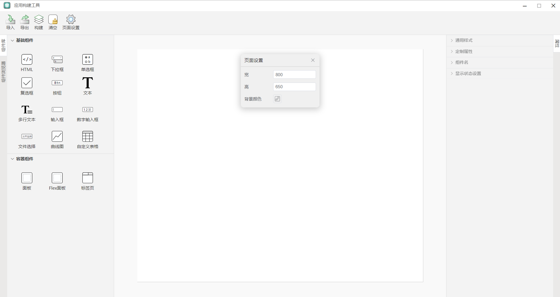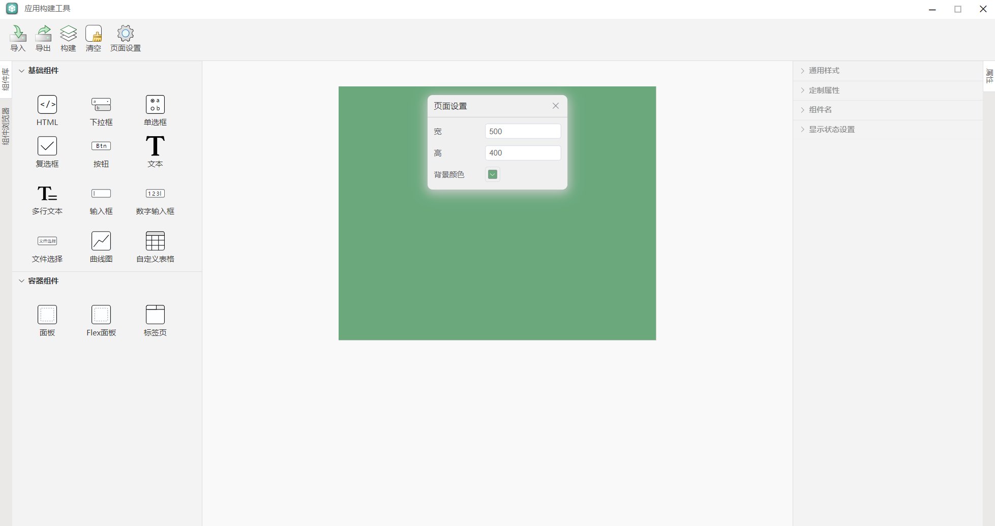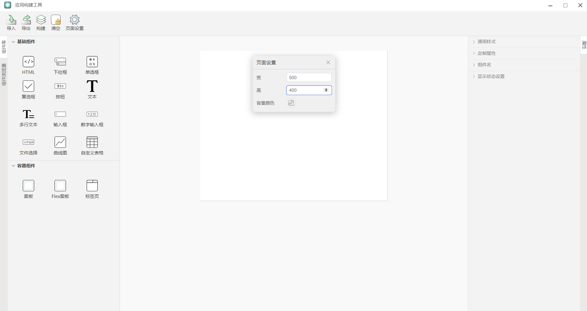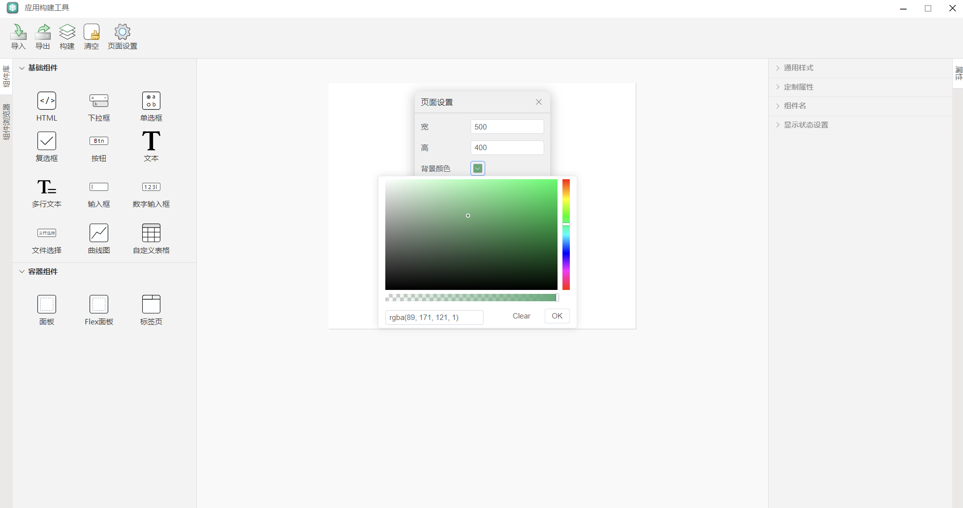 工具栏区域页面设置按钮单击,即可打开页面设置面板,用于设置 APP 的宽高及背景色。