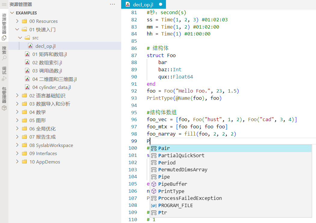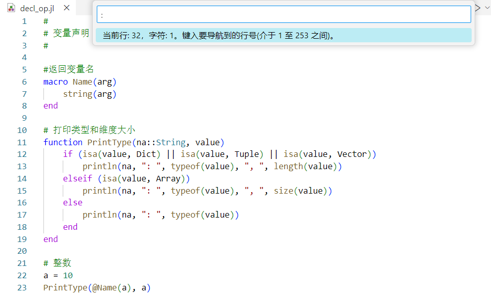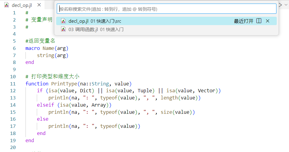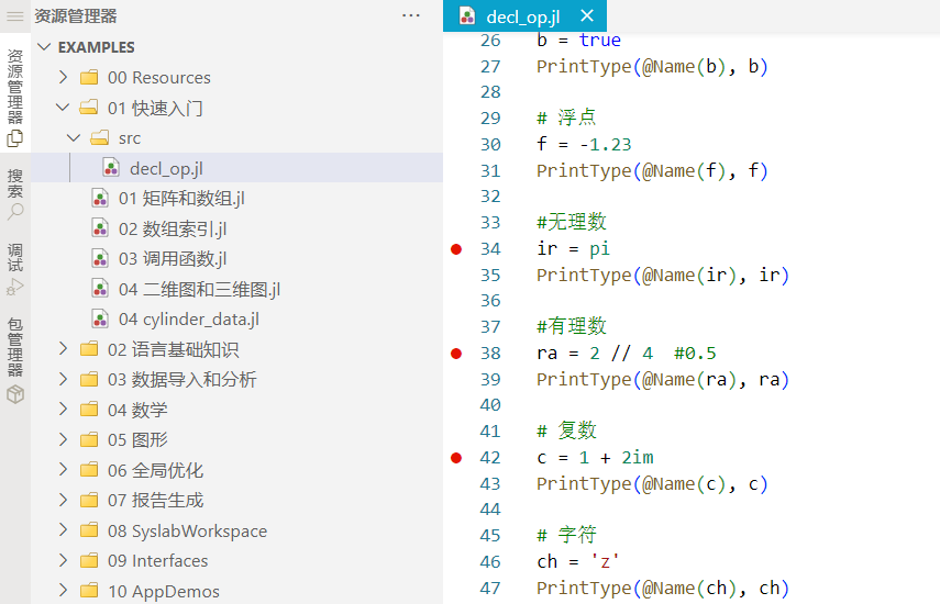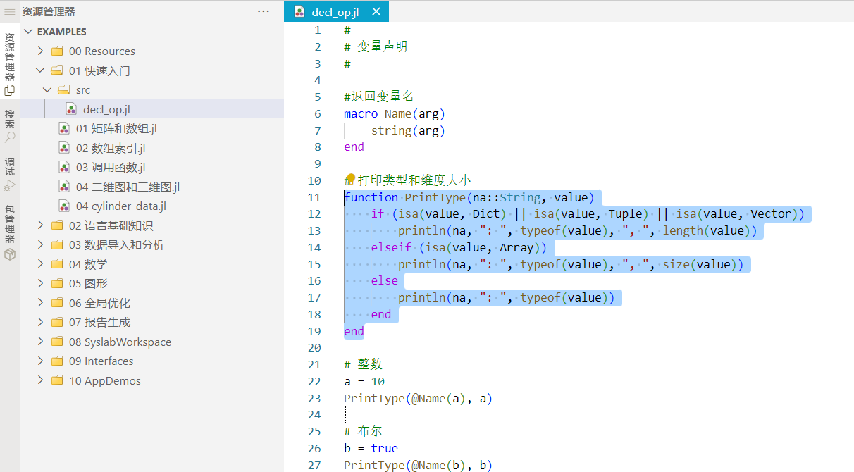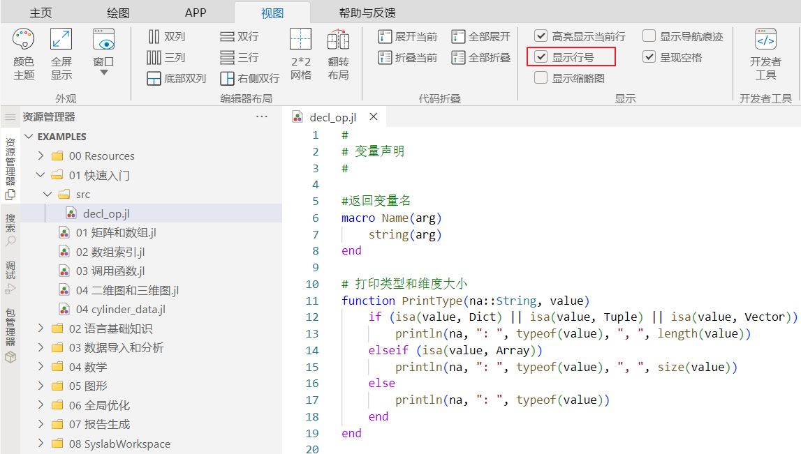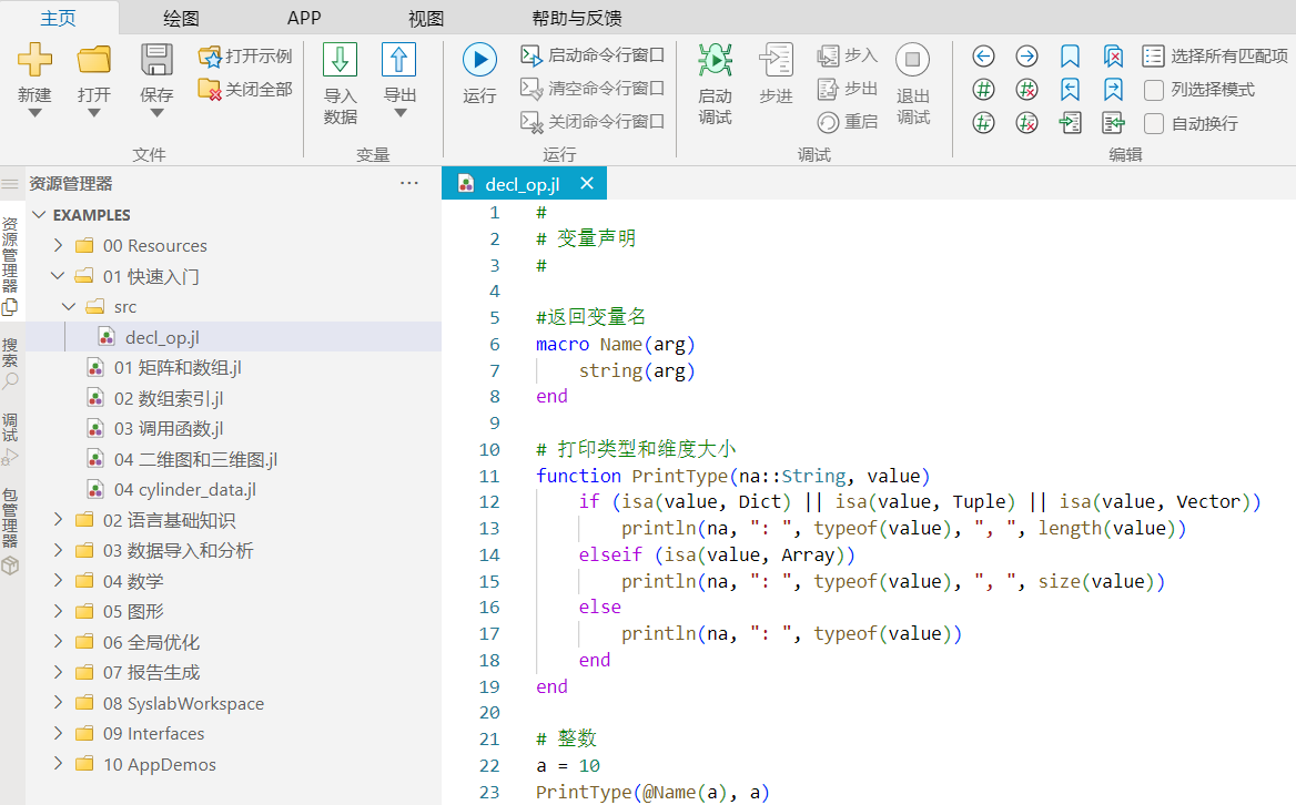 Syslab 代码编辑器提供语法高亮功能,在文本视图显示中,会对关键字及注解等语法显示不同的文字颜色。本示例中,打开 decl_op.jl 文件,界面效果如下图:
