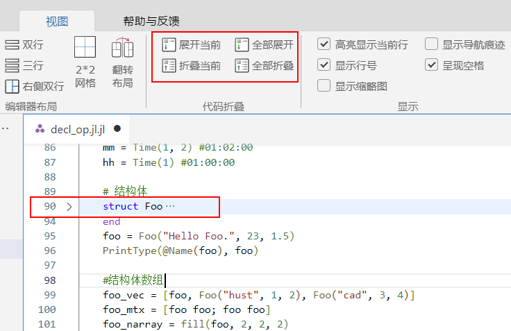 Syslab 代码编辑器提供代码折叠功能,在工具栏 Ribbon 上,选择视图页签,单击全部展开可以展开所有代码, 单击全部折叠可以折叠所有代码。同时,当用户把鼠标移动到行号右侧时,可折叠行会显示箭头标记,向下的箭头表示代码处于展开状态,向右的箭头表示代码处于折叠状态。单击箭头标记,代码折叠状态改变。本示例中,折叠结构体 Foo 代码内容,操作结果如下图: