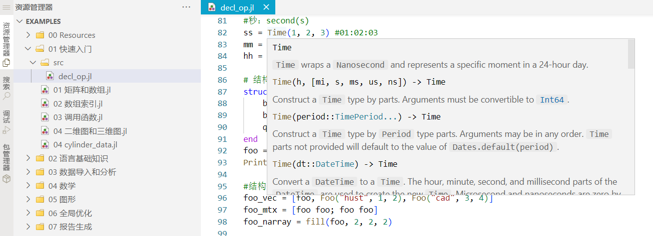 Syslab 内置 julia 语言服务,针对 .jl 文件,当鼠标悬停到某些文本上时,会弹出悬停提示窗口,窗口里会显示跟鼠标下文本相关的信息。本示例中,鼠标悬停在文本 Time 上,显示 Time 函数相关信息。界面效果如下图: