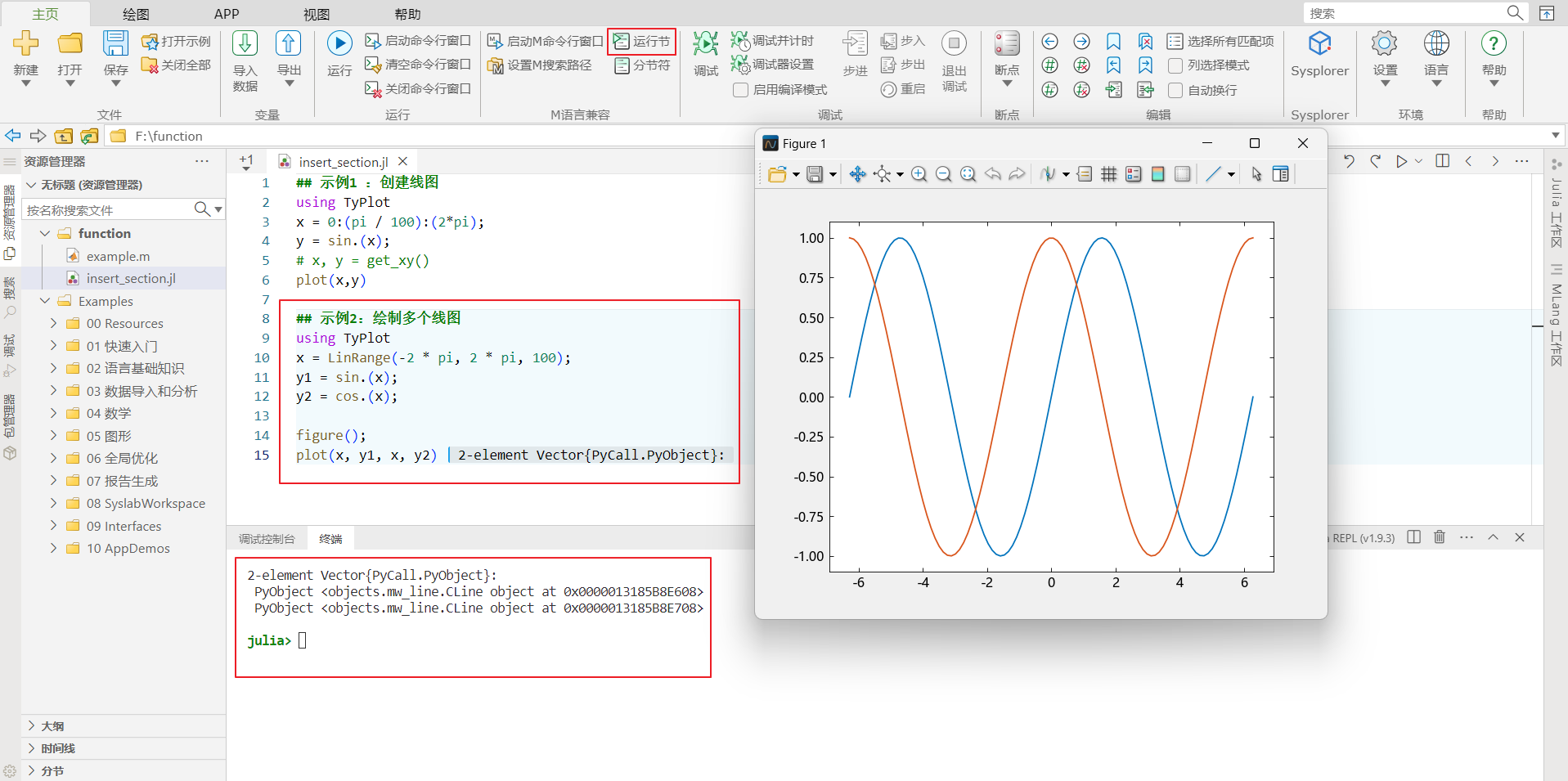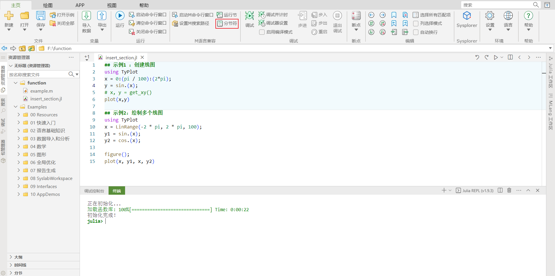 Syslab 代码编辑器提供插入分节符功能。在工具栏 Ribbon 上,选择主页页签,单击分节符按钮。您也可以在要开始新的代码节的行首输入两个注释符(对 Julia 语言来说是##,对 M 语言来说是%%), 接着输入空格,再输入任意字符,即可生成一个节。若某一个节的文本背景高亮显示,表示其为当前节。此外,Syslab 会根据分节情况自动生成大纲。如下图所示: