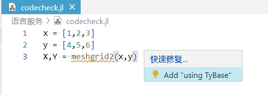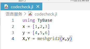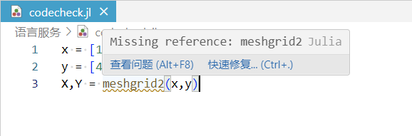 Syslab 代码编辑器提供 julia 语言的代码检查功能,当用户从资源管理器中打开文件,或将文件保存至资源管理器中,编辑器会对该文件进行代码分析,包括未定义函数、函数用法错误、语法错误等检查。