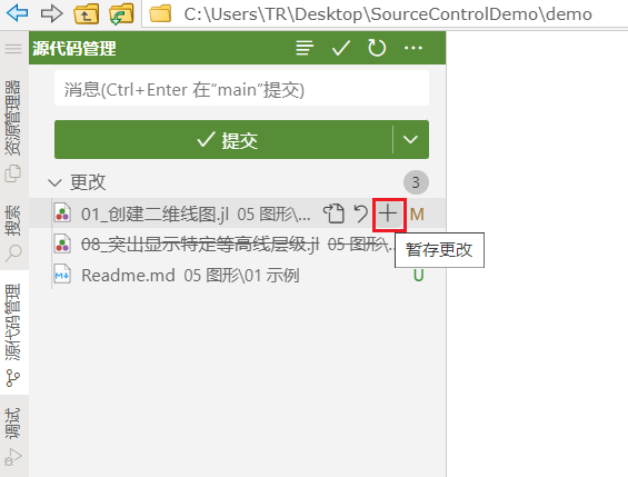 鼠标悬停在更改组列表下您要暂存的文件(夹)上,文件(夹)右侧会显示操作按钮,其中 + 代表暂存更改,单击 +,暂存更改;