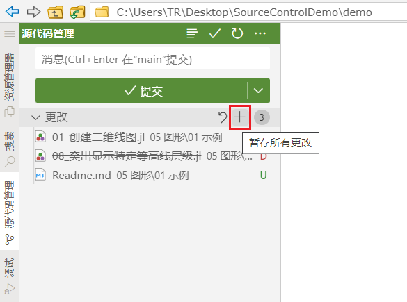 鼠标悬停在更改列表的标题上,标题右侧会显示操作按钮,其中 + 代表暂存所有更改,单击 +,暂存所有更改;