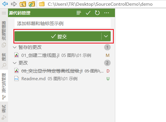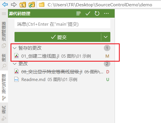 暂存后的文件(夹),会显示在源代码管理器的暂存的更改组中,等待提交。