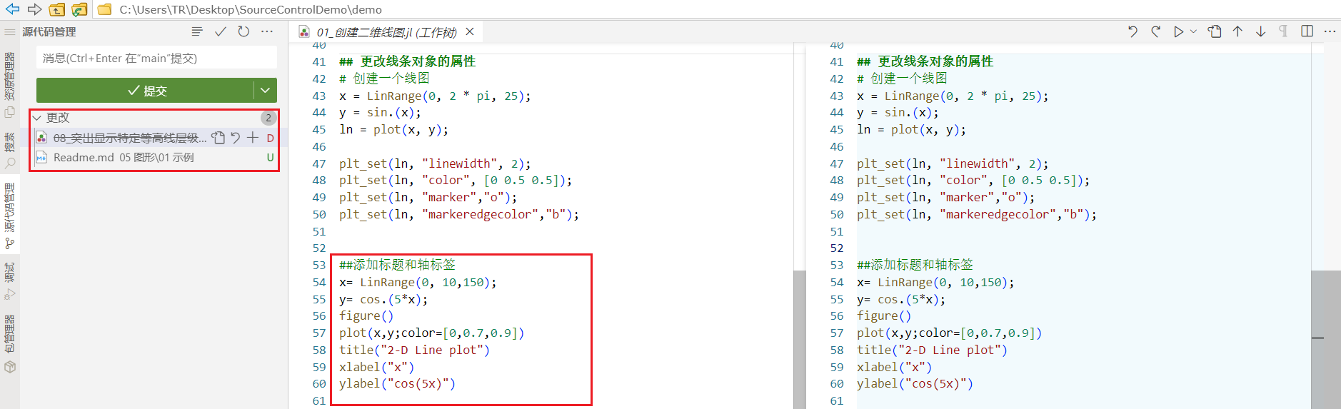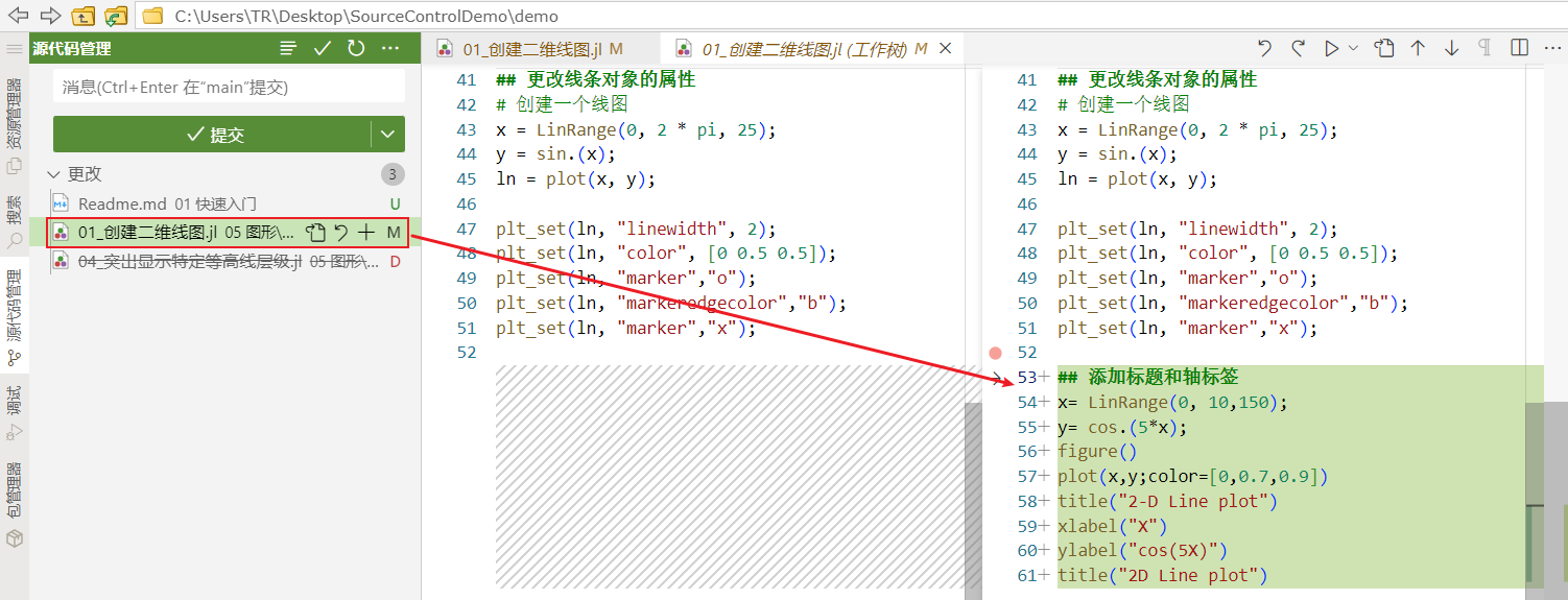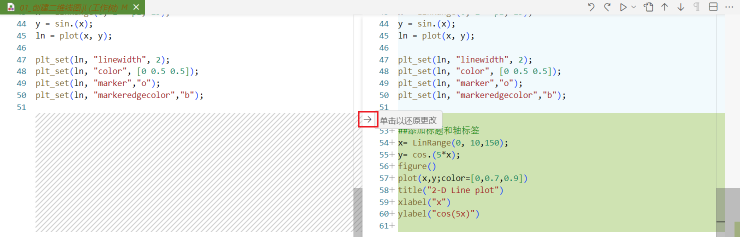 单击文件,右侧代码编辑区域打开差异编辑器,差异编辑器会显示当前版本文件与最后一次提交版本之间的差异(左侧为最后一次提交版本,右侧为当前版本)。