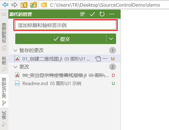 首先要提供提交信息,在源代码管理器顶部的文本框中输入提交信息;