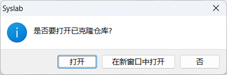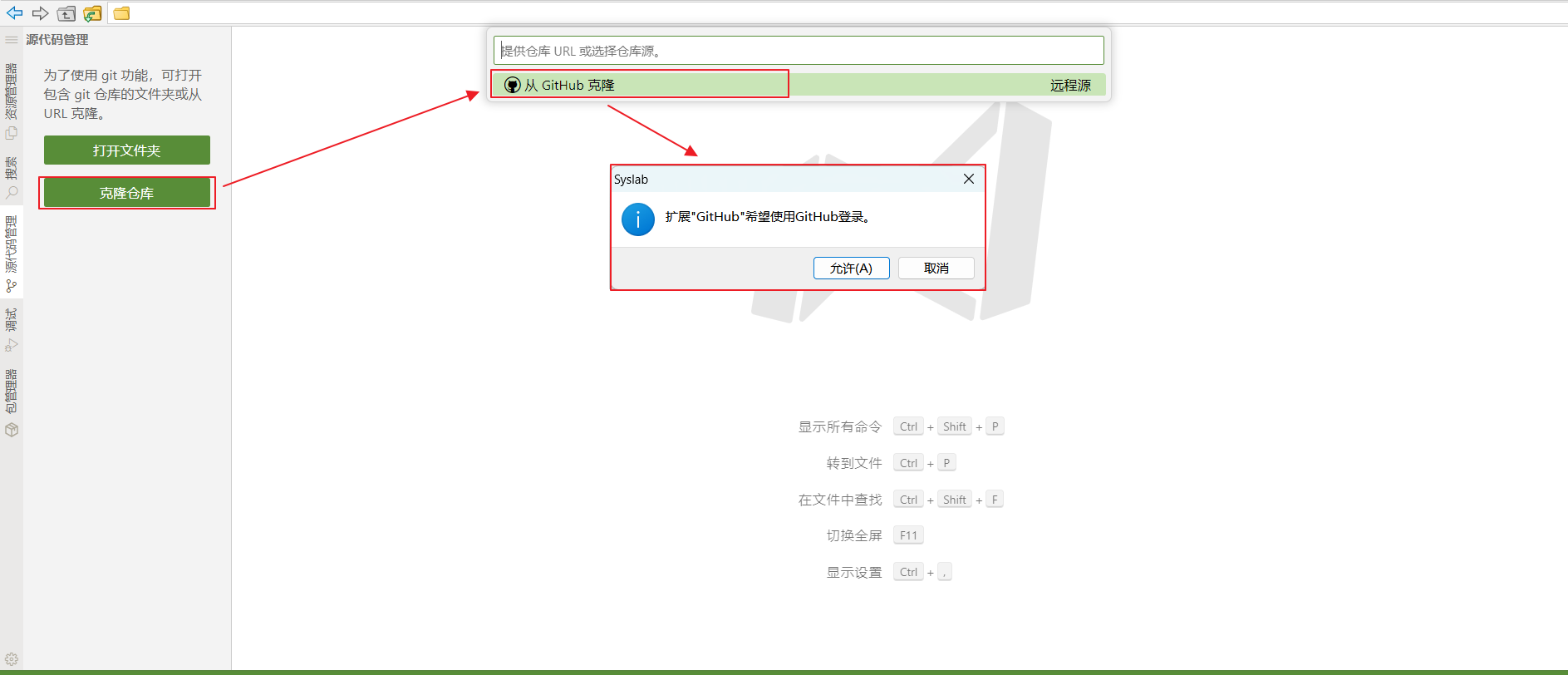 Syslab 会自动检测当前资源管理器中打开的文件夹,如果是一个 Git 仓库,Syslab 会激活所有源代码管理功能。想要使用现有的或者新的仓库,可以本地克隆远程仓库或者在本地文件夹中初始化一个 Git 仓库。