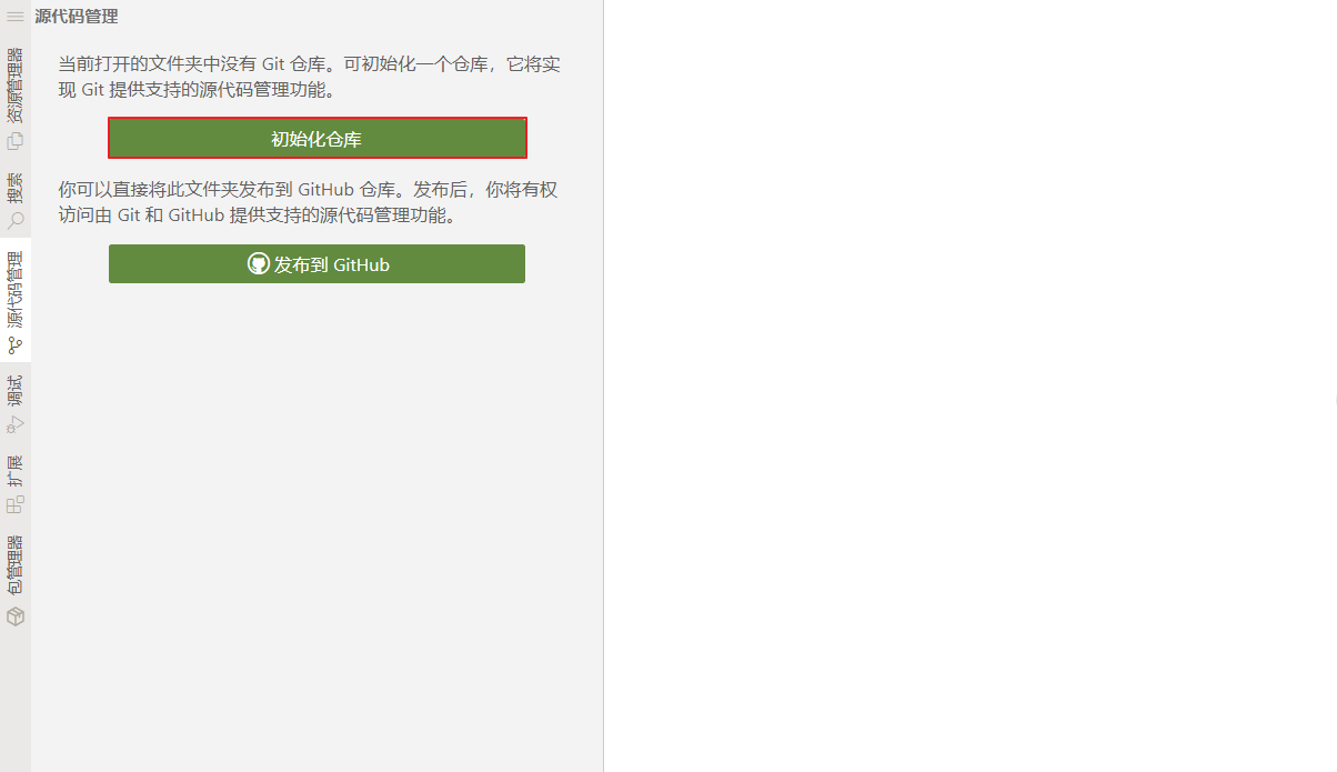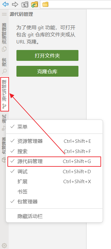 源代码管理器位于左侧边栏-源代码管理,如果左侧边栏没有显示源代码管理器,可以在左侧边栏空白区域右键,打开右键菜单,选择源代码管理,打开页面。