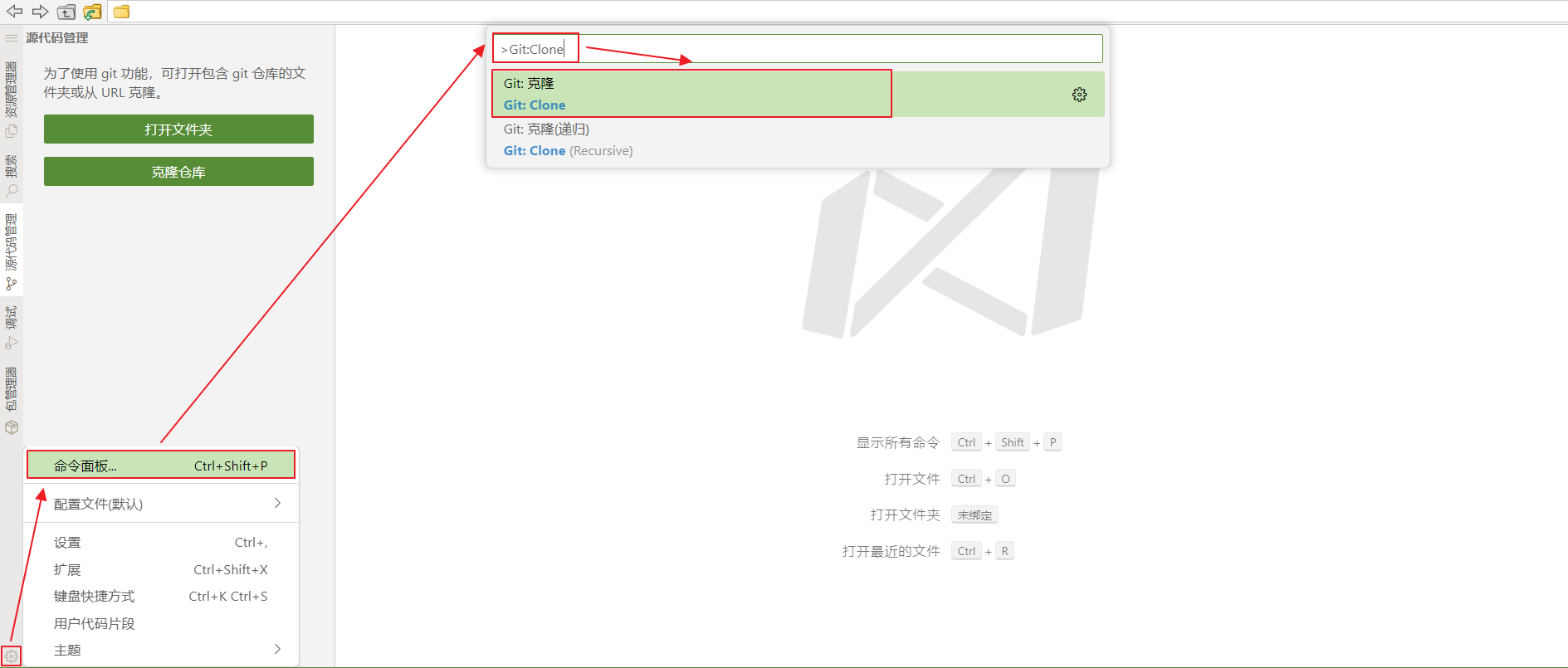 打开源代码管理(Ctrl+Shift+G),选择克隆仓库;或者打开命令面板(Ctrl+Shift+P),输入 Git:Clone;