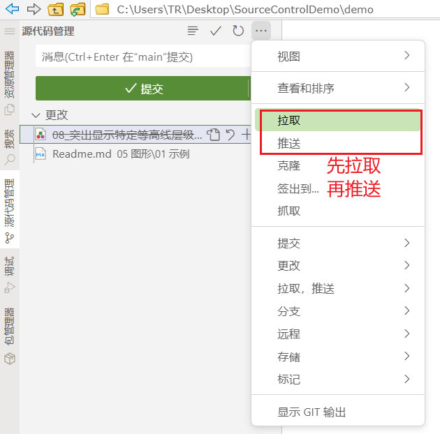如果您想要单独的拉取或推送,也可以单击右上角的视图和更多操作,分别选择拉取、推送。