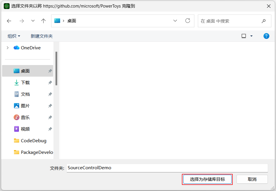 输入仓库 URL(例如,https://github.com/microsoft/PowerToys),如果您是从 GitHub 克隆,还可以登录您的 GitHub 账户,从您的仓库列表中克隆。本示例中通过 GitHub 账户克隆;