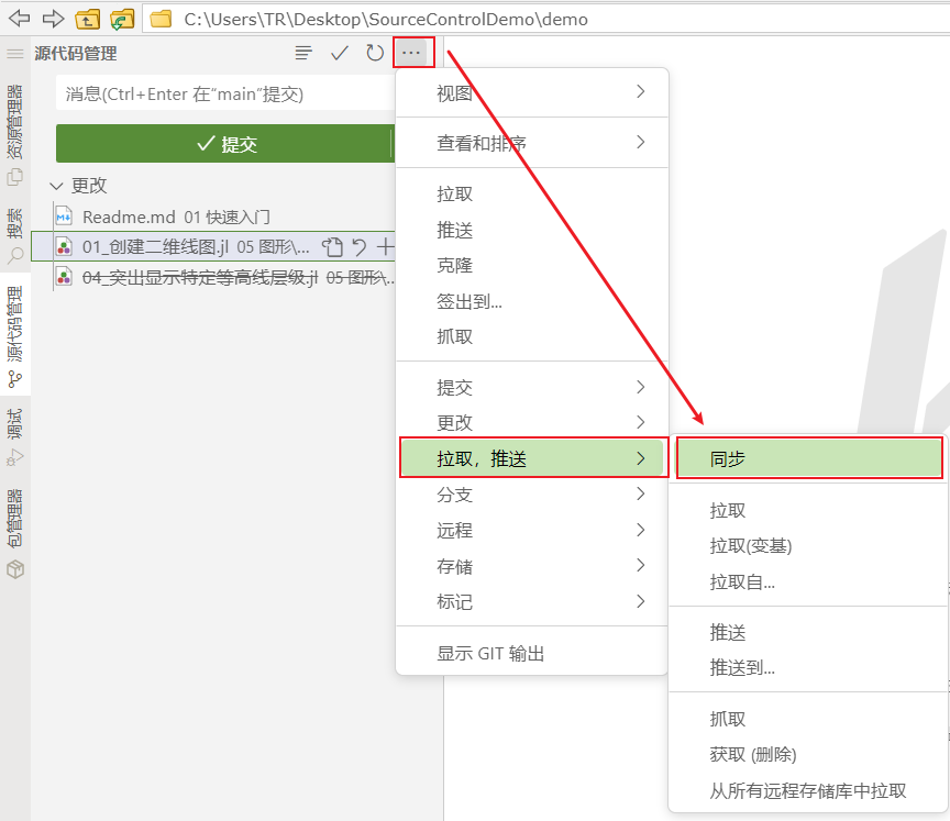 如果您的仓库链接到远程服务器(例如:GitHub),暂存提交后,您可以将本地提交与远程仓库同步。打开源代码管理(Ctrl+Shift+G),单击右上角的视图和更多操作,选择拉取,推送,右侧二级菜单中选择同步,单击后将从服务器拉取新更改并将本地提交推送到远程。