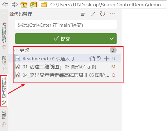 如果您对项目中的文件进行修改(修改文件内容/添加新文件/删除文件)并保存。然后想要对更改进行审查时,可以打开源代码管理(Ctrl+Shift+G),在更改组下有最近修改的文件(夹)列表,右侧显示不同的图标,含义分别为 U(未跟踪)、M(已修改)、D(已删除)。