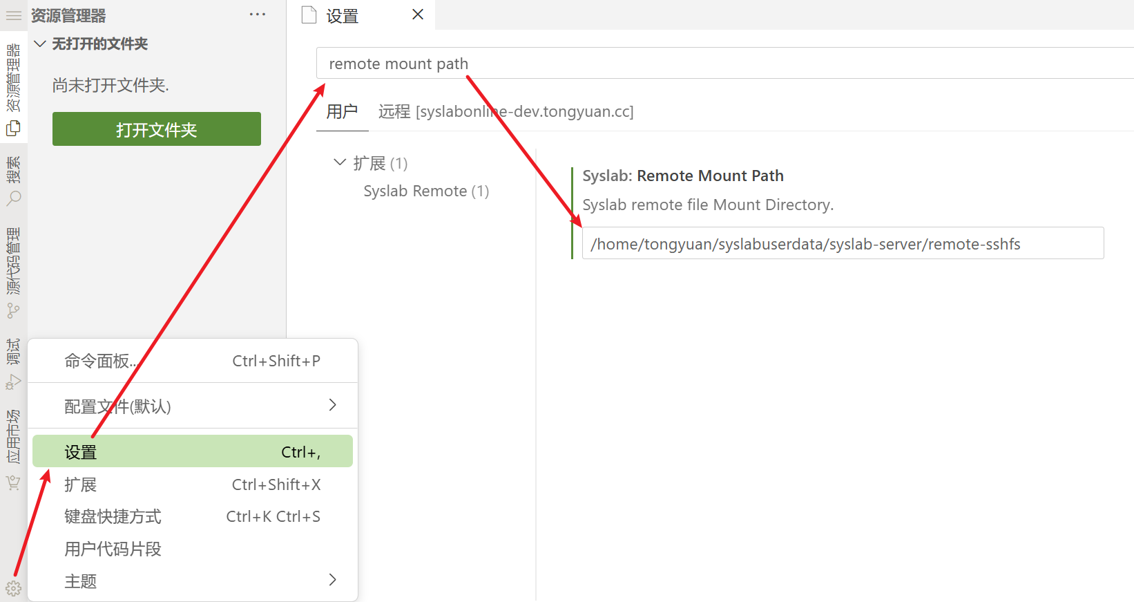 Syslab Online 左下角齿轮图标>设置>搜索 remote mount path>配置挂载目录。 该目录默认位置为用户缓存目录下的 remote-sshfs,请确保该目录下预留足够的空间挂载远程文件。