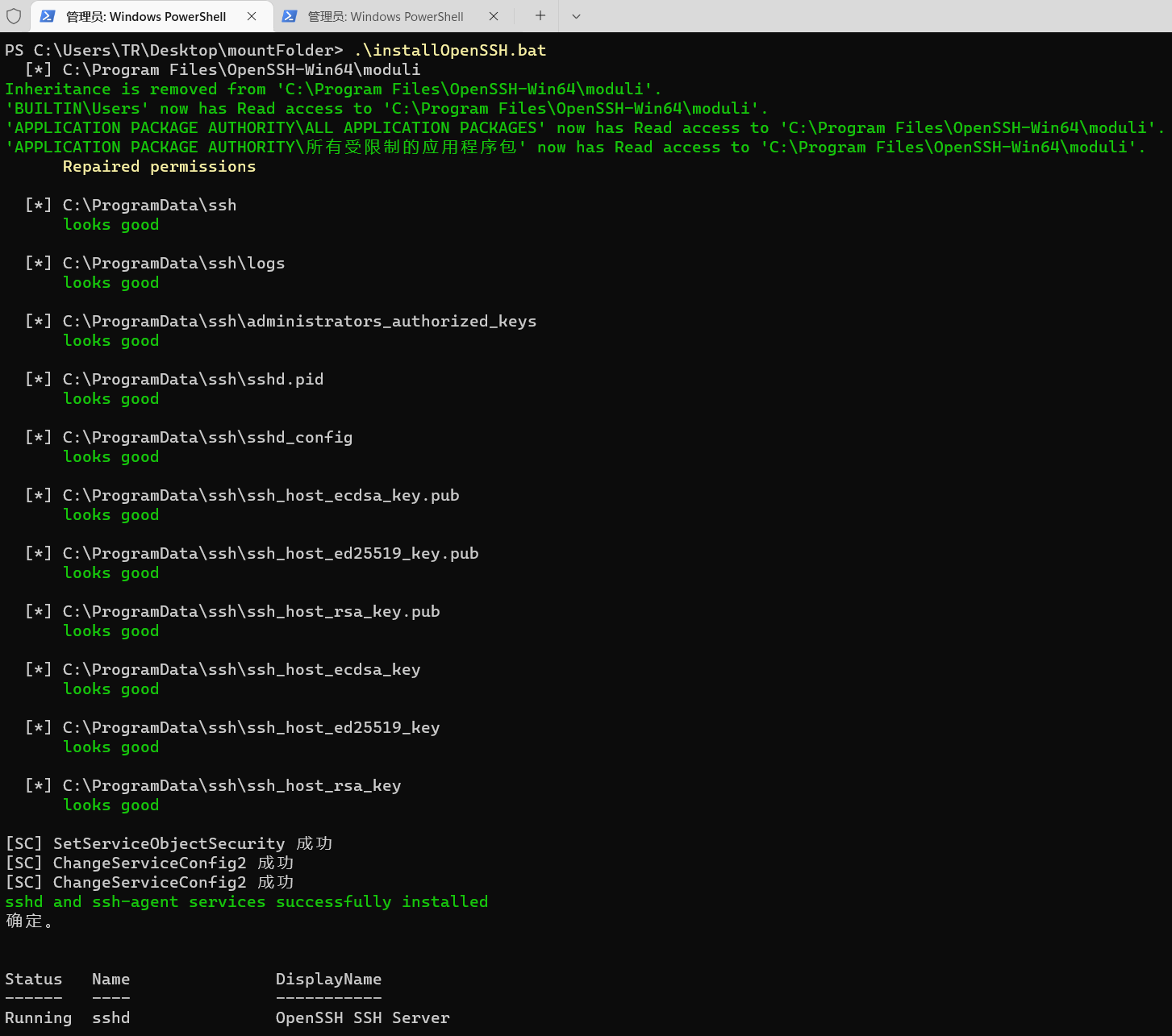 单击下载,并解压下载的文件夹,在 Windows 主机中通过管理员启动 PowerShell,进入到解压的文件夹,输入 .\installOpenSSH.bat 执行脚本安装部署 OpenSSH 服务: