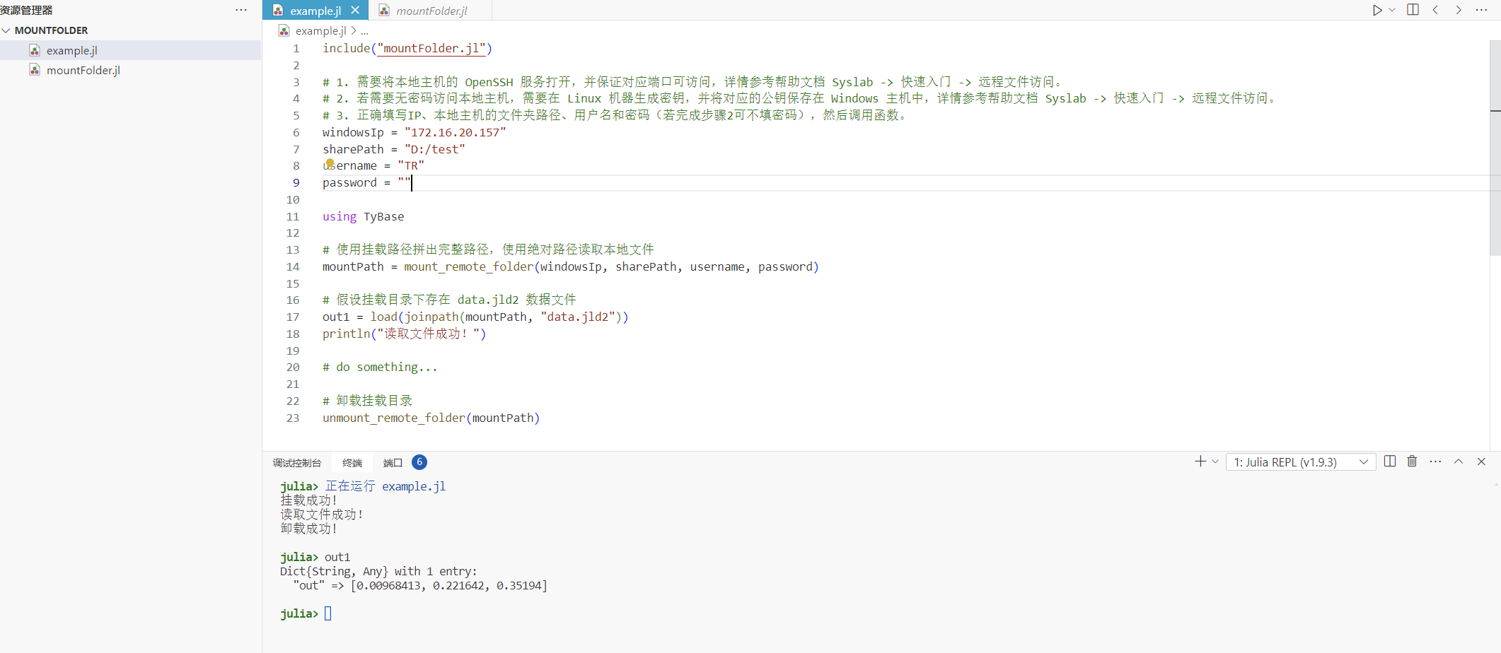 - 配置完成后,运行 example.jl 文件,即可挂载远程目录,读取 Windows 主机上 data.jld2 数据文件。