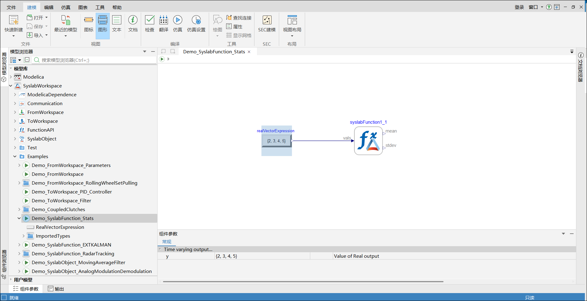Sysplorer 中模型路径为 SyslabWorkspace.Examples.Demo_SyslabFunction_Stats。